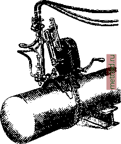 кислорода при р = 1 atm. Газовая емкость кислородного баллона определяется умножением водяной емкости его на давление газа по манометру в atm. Кислородные баллоны, для отличия от водородных и ацетиленовых, окрашиваются в синюю краску. Бутылочный вентиль кислороно-го баллона снабжен правой нарезкой - на штуцере для ма-нодетандера (см.) и левой-для водородных баллонов. Кислородные баллоны требуют большой осторожности в обращении с собой; бутыли, а также весь сварочный инструмент необходимо предохранять от соприкосновения с жиром, маслом. Эти вещества дают моментальное возгорание в кислороде, с большим выделением тепла, вследствие чего может произойти взрыв баллона. Бутыли со всякого рода Фиг. 1. Разрез стального гаЗОМ Следует дер-баллона: а-стальная тру- жать вдали от оча- ![]() ба, Ь - горловина, с, е- газовая нарезка, d - бу- гов тепла и предо- тылочный вентиль (мате- хранять ОТ ТОЛЧКОВ риал - пресованиая ла- и ударов. Открытие тунь), / - предохранит, клапан, /i-крепительное кольцо, г -пята. вентиля для выпуска газа должно производить медленно: быстрое открытие может вызвать возгорание прокладок вентиля и манодетандера. Пределы рабочего давления кислорода 0,2-3,5 atm. Редуцирование газа производится специальным сварочным редуктором, или манодетандером, устройство которого показано на фиг. 3 (ст. 99). Для пуска в ход и эксплоатации баллона следует: 1) перед открытием бутылочного вентиля повернуть регулирующий винт до момента нажатия пружины; 2) медленно открыть бутылочный вентиль; 3) открыть дроссельклапан манодетандера; 4) установить рабочее давление;5) при коротком перерыве в работе, т. 9. т. I. закрыть дроссельклапан; 6) при длительном перерыве закрыть бутылочный вентиль и ослабить регулирующий винт; 7) остерегаться масла и жира; 8) замерзший вентиль отогревать горячей водой (на фиг. 4 изображено приспособление для предохранения от замерзания - конструкции германского завода Drager-Werke). Ацетилен, принп;ипы получения его и аппараты. Наиболее широкое применение в автогенном деле имеет ацетилен (см.) CjHg, который получается в результате реакции: СаСз -Ь 2Н2О = Са(0Н)2 + CHj карбид вода гашеная ацетилен кальция известь 64 в. ч. 36 в. ч. 74 в. ч. 26 в. ч. По ЭТОЙ ф-ле из 1 кг чистого карбида получается 340 л ацетилена при 1,15 кг ила (шлама). Практически 1 кг карбида дает 250-300 л ацетилена, или 4 кг карбида дают 1 ж ацетилена. На практике для разлолсения 1 кг кар- а-бида требуется 10 л воды, что объясняет- Ь-ся необходимостью предохранить газ от перегревания и вместе с тем избежать ухудшения качества g сваренного шва.Предельная t° воды в у. ацетиленовых аппаратах 40-50°. Наиболее ходовая грануляция карбида 20- 50 мм. Наличие карбидной пыли может вызвать взрыв аппарата и значительно понижает ГаЗОПрОИЗ- Фиг. 2. вентиль баллона ВОДИТельнОСТЬ кус- в разрезе: а-маховичок, кового карбида. Аце- 5Г рк.емЖ, тилен под давлением /-уплотняющ. проклад-выше 2 atm и смесь ка, ft -верхний шпин-ацетилена с возду- гп-,гвдтр! хом при содержании г - выступ, в смеси от 3 до 65% ацетилена также легко взрывается; эта смесь самовозгорается при 400-450°. Промышленный ацетилен содержит сернистый водород, фосфористый водород, аммиак и крел1-нистый водород - вредные для качества сварки примеси. Все они, за исключением фосфористого водорода, удаляются из газа ![]()