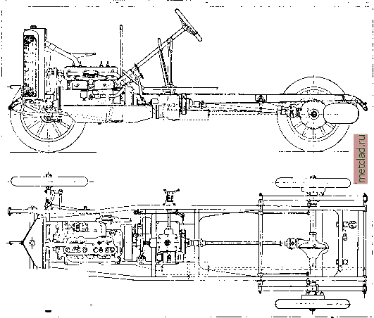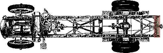 Фиг. 1. Нормальное шасси легкового автомобиля с бензиновым двигателем. неровной дороге. Ось коленчатого вала мотора направлена параллельно земле или же, с целью меньшего износа шарниров карданного вала, наклонена но направлению к дифференциалу. Сцепление служит для разъединения мотора от ведущих колес в момент переключения передач; последнее не м. б. выполнено при включенном сцеплении, т. к. под влиянием окружного усилия зубья шестерен сильно прижаты друг к дЬугу, и включение следующей пары зубчаток при разности окружных скоростей и при наличии больших масс (маховик и вся масса А.), связанных с каягдой из них, не-возмолно без поломок. Назначение сцепления- исключить одну из масс (маховик), уменьшить разность окружных скоростей включаемых шестерен, уменьшить давление на зуб включенных и тем самым свести до минимума удар при смене передач. Механизм сцепления в большинстве случаев выполняется в виде одного стального диска, трущегося по двум связанным с маховиком поверхностям, обшитым фврродо (фиг. 3); момент инерции освобождающейся части (диск) такого сцепления очень мал, и включение передач происходит без удара. Грузовые А. и автобусы с более тихоходными моторами, обладающие большим крутящим моментом, снабжаются сухими многодисковыми сцеплениями (фиг. 4); реже встречаются сцепления конусом и многодисковое- ![]() Фиг. 2. Нормальное шасси грузового автомобиля.