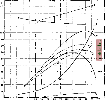 г- КС Полный вес автомобиля Фиг. 37. Расход бензина и масла грузовыми автомобилями на 100 хле по данным пробега 1925 г. (3,6)2 где F-лобовая площадь сопротивления А. в Л1* (берется или по точному обмеру или приблизительно равной ширине хода колес на расстояние от земли до наивысшей точки; средние значения-для легковых А. 1,5-2,5 Л1*, для грузовиков 4,0-6,0 Jm2); - коэффиц. сопротивления воздуха (значения его даны выше), V - скорость А. в км/ч. Окружное усилие, развиваемое мотором на окрулности задних колес, во избежание буксования должно удовлетворять условию где f - коэффициент трения между шиной и дорогой (для влажной дороги 0,2, для сухого асфальта 0,7; при расчете обычно берут 0,4), - сцепной вес А., т. е. вес, приходяшийся на ведущие колеса (если ведущие колеса только задние, то обычно Qc равно от 0,56 до 0,62 от общего веса Q для легковых и 0,65-0,70 для грузовых А.). Определив по вышеприведенной формуле мощность мотора согласно тем общим ![]() Va км/ 10 20 30 40 300 еОО 900 1200 1500 1800 2100 2400 2700 3000 3300 Фиг. 38. Испытание автомобиля Мерседес-Даймлер. условиям, к-рым доллген удовлетворять А., 900 N подсчитывают по ф-ле у\ = литраж мотора, задавшись кривой ср. эффект, давления. После определения характеристики мотора и после выявления точных размеров и веса А. производится повторный подсчет, где окончательно определяются динамические качества А. Кроме ф-л, указанных выше, определяющих тормозную мощность мотора, в западных странах применяются ф-лы налоговой мощности, характеризующие гл. обр. размерность мотора, а не действительную мощность. У нас применяется немецкая формула налоговой мощности А= 0,3 . S . г, где d - диаметр цилиндров в см, S - ход поршня в м, г - число цилиндров мотора. Применение компрессорных моторов повышает динамические качества автомобиля. Идея компрессорных моторов заключается в увеличении заряда рабочей смеси помощью повышения объемного коэфф-та наполнения; последнее достигается тем, что воздух, идущий на образование рабочей смеси, поступает в цилиндр под давлением, а не под влиянием разрежения во время хода всасывания; одновременно с увеличе- нием, количества воздуха, подача бензина в карбюратор тоже повышается - или помощью особого насоса, включаемого в действие одновременно с компрессором, или же путем повышения давления в бензиновом баке. Конструкции воздушных компрессоров бывают центробежные, поршневые и крыльчатые типа Рато. Поплавковая камера карбюраторов компрессорных моторов непосредственного сообщения с атмосферой не имеет. На фиг. 38 /о даны результаты испыта-100 ния автомобиля Мерседес-Даймлер (15/70/100) с во компрессорным мотором (6 X 80 X 130). Обозначения кривых следующие: А-фактическая эффект. ° мощность мотора без компрессора; D-мощность, к-рую можно было бы получить от этого не мотора, если бы всасывающие трубы и к.дапаны сделать нормального сечения (предвидя постановку компрессора, последние выполнены заводом более узкими); С - мощность, которую молено было бы получить от этого же мотора без компрессора, увеличив до возможного максимума степень его сжатия и пе-% реведя работу на бензол; 100 в-фактическая мощность, получаемая с мотора при работе с компрессором на бензине; iW+r) - кривая сопротивления движению автомобиля, IV ск.- мощность автомобиля на четвертой передаче при работе с компрессором, К~ выигрыш в мощности от применения компрессора, аоЪ - коэффициент объемного напол