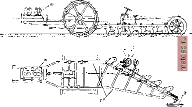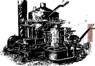 Главная --> Промиздат --> Абразионные материалы 2-осной (50 IP)-27 ООО р. Стоимость, отнесен, к одному пасса,5кирскому месту, для А. примерно вдвое больше, чем для пригородного парового поезда на 1 ООО пассалшров. Большинство А. работает на легких горючих маслах, т.е. на опасных в пожарном отношении бензине или бензоле, стоимость которых по сравнению с другими топливами очень высока. Расход топлива одинаковой теплопроиз-водительности (нефть для паровоза и бензин для А.), отнесенный к одной IP, в паровозе в 4 раза больше, чем в А.; но т. к. бензин не менее чем в 4 раза дороже нефти, то стоимость топлива получается в обоих случаях одинаковой. Отсюда стремление перейти к более дешевым видам топлива - к сырой нефти, применяя быстроходные двигатели Дизеля, и к коксу или антрациту, применяя газогенераторы. Двигатели, работающие на газе, мало чем отличаются от бензиновых двигателей, поэтому к оборудованию вагона приходится лишь добавить газогенератор, состоящий из двух аппаратов. Стоимость топлива при газогенераторе составляет около 30% от стоимости бензина. Емкость генератора не требует перезарядки его па пробег в 180 %м. Строит А. и для перевозки грузов (на фпг. 4 показана товарная А.с подъемной силой 5 т, с мотором в 40 ЬР); при моторе в 80- 100 IP А. в состоянии еще вести прицеп с полезным грузом в 10 т. Лит.: Railway Engineering а. Maintenance Cyclopedia, 2 ed., N. Y., 1 920. П. Нрасовсний. АВТООКИСЛЕНИЕ, ( kik лнкмыпл;! процесс, связанный с превращением кислорода в особое деятельное (активное) состояние. Это активирование кислорода происходит за счет энергии окисляющегося те-.тта, и поэтому автоокисляться способны только такие вещества, которые обладают некоторым избытком свободной химической энергии. В качестве первичного продукта окисления образуются перекиси, структурно характеризующиеся присутствием группы - 0-0-, свободные валентности которой насыщены двумя одновалентными или одним двувалентным минеральным или органическим остатком. Перекиси содерл:ат половину присоединенного кислорода в слабо связанном, активном состоянии и потому легко уступают его другим телам, т. е. являются более или менее сильнтлми окислителями. Процесс автоокисления можно выразить следующей схемой: А -f Ог = ное отнимать атом кислорода от перекиси, то механизм процесса примет след. вид: А -f Ог = АОг AOj-fBAO+BO. Подробности и теорию процесса см. в статье Окисление. с. Медведев. АВТОПЛЕЙТ, пресс, отливающий полукруглые стереотипы для газетных ротационных маншн. Состоит из трех основных частей: котла для расплавленного металла Ж, насоса и отливной формы Б (см. фиг.). Насос ручной, поршневой, забирает чисты!! расплавленный металл из глубины котла и накачивает его через рукав в отливную форму. Последняя состоит из двух частей: пустотелого барабана (ядра) и отодвигающегося цилиндрического пустотелого ложа Л для матрицы. Бумалгная матрица закреп- ![]() окисл. тело А + перекись 2А0. АО, = Если в реакционной системе присутствует какое-нибудь тело В, не способное присоединять молекулярный кислород, но снособ- ляется замками в форме, которая поворотом рукоятки А придвигается к ядру. Налчи-мом на рычаг Е насоса металл накачиваете! меладу формой и ядром. Подаваемая через трубу ИЗ вода охлалодает отлитый стереотип. При помощи мотора барабан приводится в двиление. Вращаясь, он поворачивает отлитую полосу, прижимая ее к фрезеру, отрезающему 