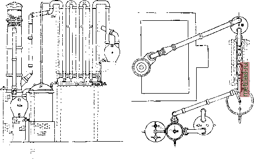 0,182 0,27 3 0,366 О, 577 0,695 0, 822 0,957 1,080 1,193 1,339 1,476 1, 537 1,600 1,810 2,278 2, 392 2,447 в 4 см толщ. В каледый цилиндр входит 75 кг селитры и 75 кг H2SO4. Пары проводят сначала через керамиковый холодильник, охла-Лчдаемый водой, или через наклонную керамиковую трубу, потом через поглотители: баллоны или бонбоны , т. е. большие керамиковые вульфовы склянки . Если взята серная кислота 60° В6 (71%) и в первый поглотитель помещено 4 кг воды на 100 кг селитры, то получится кислота в 40 - 42° Вё (38 - 41%); применив кислоту в 66° Вё (99,6%) и сухую селитру, получим 50° Вё (53%); для получения кислоты в 36° Вё, в первый поглотитель помещают 8 л воды, во второй - 4 л, а в следующие по 2,6 л. Дымящую А. к. получают, действуя на селитру вдвое меньшим количеством серной кислоты, чем следует по расчету. По этому способу получается кислота, загрязненная хлористым нитрозилом и другими веществами, отходящими в начале процесса, и окислами азота - в конце отгонки. Окислы азота сравнительно легко отогнать, продувая через кислоту ток воздуха. Гораздо выгоднее работа в ретортах, охватываемых со всех сторон огнем и имеющих снизу трубу для выпуска бисульфата, содержащего заметное количество кислоты. Дело в том, что чугун не разъедается кислотой, если он достаточно нагрет и если соприкосновение огнем со всех сторон гарантирует от осансде-ния капель кислоты. В подобных ретортах (1,20 шир. и 1,50 jn диам., со стенками в 4-5 см толщ.) селитру обрабатывают серной кислотой из расчета 450 кг и даже 610 кг селитры на 660 кг HgSO* (66° Вё). Вместо баллонов теперь часто применяют вертикальные трубы или соединяют эти трубы с баллонами. По способу Гутмана разложение производится в чугунных ретортах, составленных пз нескольких частей (фиг. 1 и 1а); части со- ![]() единены замазкой, состоящей обычно из 100 ч. железных опилок, 5 ч. серы, 5 ч. хлористого аммония с возможно малым количеством воды; реторты и, по возможности, загрузочный люк заключены в кирпичную гсладку и нагреваются печными газами. В реторту загружают 800 кг селитры и 800 кг 95%-ной серной кислоты и ведут перегонку 12 час; при этом тратится ок. 100 кг угля. Применяются также и цилиндрические реторты. Выделяющиеся пары попадают сначала в баллон 8; затем проходят ряд керамиковых труб, 12 и 13, помещенных в деревянный короб с водой; здесь пары сгущаются в А. к., которая сте- Фцг. la. чугунная реторта кает по трубам 22 установки Гутмана. Я 23 В сборник 28, сюда же попадает и конденсат из баллона 8; не сгустившаяся в трубах 12 А, к. попадает через 15а в башню, заполненную шарами и омываемую водой; последние следы кислоты, не поглощенные в башне, улавливаются в баллоне 43а; газы же через трубу 46а уносятся в дымовую трубу. Для окисления образующихся при перетопке окислов азота к газам непосредственно при выходе из реторты примешивается воздух. Если в производстве применяется крепкая серная кислота и высушенная селитра, то получается бесцветная 96-97%-ная А. к. Почти вся кислота конденсируется в трубах, лишь малая часть (5%) поглощается в башне, давая 70%-пую А. к., которую прибавляют к следующей загрузке селитры. Т. о. получается бесцветная А. к., ![]() Фиг. 1. Получение азотной кислоты из селитры (установка Гутмана). лишенная хлора, с выходом в 98-99% от теории. Способ Гутмана получил большое распространение в виду простоты и дешевизны установки. Из селитры добывают 96-100%-ную кислоту по способу Валентинера, перегонкой под уменьшенным давлением (30 мм) в