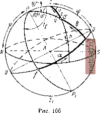 Главная --> Промиздат --> Астрономические методы в рассматриваемой системе координат положение светила а определится: 1) дугой большого круга Z, которая измеряет зенитное расстоя-я п е светила и обозначается через z\ 2) двугранным углом а между плоскостью астрономического меридиана PZPZi и вертикальной плоскостью ZdZ, называемым азимутом светила и отсчитываемым, как принято в астрономии, от южной части меридиана, по ходу часовой стрелки. Иногда в астрономии вместо координаты z применяют высоту h, равную 90° - Z и измеряемую дугой Мо; h соответствует употребляемому в геодезии углу наклона. Малые круги небесной сферы, параллельные плоскости горизонта, т. е. круги равных высот, называются альмукантаратами. Если обозначить через А азимут при счете его от северной части меридиана, то Л = а± 180°. Вследствие вращения Земли вокруг оси видимое из точки А положение светила а на сфере непрерывно изменяется, совершая полный оборот в течение суток. Видимое движение светила в течение суток совершается по малому кругу са, называемому суточной параллелью. Таким образом, для данной точки наблюдения А значения координат z и о будут различны в разное время суток. В разных точках земной новерхности отвесная линия имеет разное направление, поэтому в один и тот же момент времени, но для различных точек наблюдений горизонтные координаты одного и того же светила также не будут одинаковыми. В течение суток светило, совершая видимое движение, дважды пересекает астрономический меридиан - в точках с ш d. Положение светила в меридиане называется кульминацией светила. Кульминация, ближняя к зениту, называется верхней кульминацией, дальняя - нижней кульминацией. В верхней кульминации зенитное расстояние достигает наименьшего значения, а в нижней кульминации - наибольшего. Азимут светил в моменты кульминаций имеет значение О или 180°. 2. Первая экваториальная система координат. Возьмем вспомогательную сферу и построим те же точки и круги. Кроме того, проведем большой круг QQ, плоскость которого перпендикулярна к оси Мира (рис. 164). Этот круг, называемый астрономическим, пли небесным, экватором, примем за один из кругов, относительно которых будем определять положение светила а на сфере. В качестве другого координатного круга возьмем по-прежнему астрономический меридиан PZPiZi-Тогда положение светила о в рассматриваемой системе координат определится: 1) дугой аГ, которая называется склонением светила и обозначается буквой б; круг РТ, перпендикулярный к экватору, по которому отсчи-тывается склонение б, называется кругом склонений; ![]() Рис. 164 2) двугранным углом t между плоскостью астрономического меридиана и плоскостью круга склонений, называемым часовым углом; часовой угол отсчитывается от меридиана в направлении, противоположном направлению вращения Земли, от О до 360°; иногда он отсчитывается в обе стороны от меридиана от О до ±180°, в этом случае часовые углы, отсчитываемые к западу, считаются положительными, а к востоку - отрицательными. В процессе суточного движения светило с перемещается по параллели cod, все точки которой находятся на одинаковом расстоянии от астрономического экватора, равном склонению б светила; поэтому склонение б не зависит от суточного движения небесной сферы. Часовой угол изменяется от О до 360° и притом пропорционально суточнохму вращению Земли. 