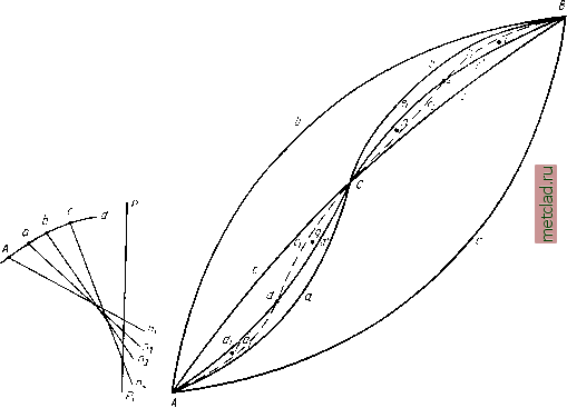 Главная --> Промиздат --> Астрономические методы Нетрудно видеть, что несовпадение прямых и обратных нормальных сечений, или, как говорят, двойственность нормальных сечений, приводит к тому, что измеренные горизонтальные углы на трех пунктах не образуют на поверхности эллипсоида замкнутого треугольника; фигура получается разорванной . Эту неопределенность в образовании треугольников можно устранить, если их вершины соединить геодезическими линиями. § 12. Геодезическая линия Между двумя точками на любой поверхности можно провести множество кривых. В геодезии решение задач по определению взаимного положения точек земной поверхности основано на построении на ней определенных фигур (обычно треугольников) и вычислении числовых значений элементов этих фигур. Поэтому следует решить, какими кривыми соединять точки поверхности земного эллипсоида при вычислении элементов геодезических построений. В сфероидической геодезии точки на поверхности эллипсоида соединяются геодезическими линиями, которые определяются как кратчайшие расстояния на данной поверхности между заданными точками. Следовательно, геодезическая линия на данной поверхности играет роль прямой линии на плоскости или дуги большого круга на сфере. Введением геодезической линии устраняется неопределенность в построении геометрических фигур на поверхности земного эллипсоида и достигается однозначность решения задачи. Из определения геодезической линии, как кратчайшей кривой между двумя точками на земной поверхности, следует и иное ее определение: геодезическая линия на поверхности - такая кривая, в каждой точке которой соприкасающаяся плоскость проходит через нормаль к поверхности в той же точке. Докажем это свойство геодезической линии. Возьмем на поверхности эллипсоида три близкие точки М, N, К, через которые проведем плоскость. Как известно из дифференциальной геометрии, предельное положение плоскости при М N и К -> N носит название соприкасающейся плоскости; касательная в точке N лежит в соприкасающейся плоскости; главная нормаль в точке N совпадает с нормалью к поверхности. Проведем через точку N различные кривые, имеющие общую касательную NT\ согласно теореме Менье, наибольший радиус в точке N будет иметь та кривая, в соприкасающейся плоскости которой лежит нормаль к поверхности в точке N. Возьмем точку iVj, расположенную на бесконечно малом расстоянии от точки N, и проведем между ними всевозможные кривые; наикратчайшей кривой из них будет та, которая имеет наибольший радиус (наименьшую кривизну). Следовательно, согласно сказанному ранее, наикратчайшей линией между двумя бесконечно близкими точками будет элемент той кривой, в соприкасающейся плоскости которой лежит нормаль к поверхности. Распространяя этот вывод на кривую конечной длины, получаем, что кривая на поверхности, в каждой точке которой соприкасающаяся плоскость проходит через нормаль в той же точке, является наикратчайшей, т. е. геодезической линией, иначе геодезическая линия на данной поверхности - такая кривая, в каждой точке которой главная нормаль совпадает с нормалью к поверхности. Из определения геодезической линии и понятия соприкасающейся плоскости можно себе представить следующий геометрический метод построения геодезической линии на земном эллипсоиде. Пусть РР (рис. 20) - мала