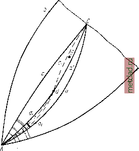 Главная --> Промиздат --> Астрономические методы соида, которые пересекут ее в точках /, g, h, i; проводим нормальные плоскости в этих точках, проходящие соответственно через точки 4, d, С, е, J5, затем соединяем хордами точки А ж f, f ж d, d и f и т. д., т. е. выполняем во вновь отмеченных точках такие же действия, как и раньше. Если продолжать такое построение до бесконечности, то плоскости, проводимые через нормаль в середине каждой хорды, обратятся в соприкасающиеся плоскости. Число хорд, а следовательно, и число точек пересечения нормалей, проходящих через середины хорд, будет бесконечно велико. Эти точки образуют непрерывную кривую, которая и будет геодезической линией так как выполнено условие, определяющее геодезическую кривую; в каждой точке ее нормаль к поверхности будет лежать в соприкасающейся плоскости кривой. ![]() ![]() Рис. 23 Рис. 24 В результате построения (тем или иным путем) геодезическая линия займет положение относительно взаимных нормальных сечений, показанное на рис. 23. При азимутах линий, не близких к 90 или 270°, положение геодезической линии относительно взаимных нормальных сечений будет несколько иным. Определим приближенно угол, который образует геодезическая линия с прямым нормальным сечением. При азимутах линий, близких к 90 или 270°, нормальное сечение, которое проходит через нормаль к поверхности эллипсоида, проведенную из середины хорды, соединяющей конечные точки кривой, делит углы между взаимными нормальными сечениями пополам. Так, на рис. 21 сечение АсСсБ делит пополам углы при А жВ между кривыми АаВ ж ВЪА, сечение AdddX делит пополам углы при АжС между кривыми АаСжАсС. Это положение доказывается в фундаментальных курсах высшей геодезии [27, стр. 56-57]. К этому же выводу можно прийти на основании геометрических соображений. Воспользуемся этими свойствами кривых на эллипсоиде для приближенного решения поставленной задачи. Обозначим: Л - угол между взаимными нормальными сечениями в точке А, т. е. между кривыми АаВ ж ВЪА, б - угол начального элемента геодезической линии в Л с прямым нормальным сечением на J5, т. е. с кривой АаВ. Будем иметь (см. рис. 21 и 24) углы между (Кривыми: АсС и АаВ, равный АсС АаС Adj D АсС Addyy АаВ Add Aad Adid Afd Afd ЛйВ 4 Д IF д <и т. д. В пределе, при бесконечном продолжении описанного выше построения, угол между кривой АаВ ж нормальным сечением, проходяш;им через нормаль, проведенную из середины ближайшей к точке А хорды, обратится в б. Тогда до аналогии с написанной выше таблицей будем иметь: