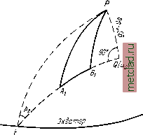 Главная --> Промиздат --> Астрономические методы По способу Бесселя задача решается по следующему плану: 1. Треугольник АРВ (рис. 54) переносится на шар по заданным трем элементам треугольника при помощи основного уравнения геодезической линии cos wsin Лх 2 = сод 2sin л 2.1 = с. (29.1) 2. После указанного перехода полученный на сфере треугольник АРВ (рис. 55) решается относительно известных его элементов. Зппипсоид ![]() f\iBj.L,) ![]() Рис. 54 Рис. 55 3. От вычисленных из решения сферического треугольника элементов осуществляется переход к соответствующим элементам сфероидического треугольника. Остановимся подробнее на переходе от сфероидического треугольника АРВ к сферическому АРхВу. Если обозначим элементы сферического треугольника так, как показано на рис. 55, то уравнение геодезической линии (29.1) представит собой одновременно точную зависимость, вытекающую из теоремы синусов для этого треугольника sin Ах 2 sin (180° -/12. i) (29.2) ![]() Рис. 56 Sin (90° -Из) sin(90° -ui) Отсюда можно установить соотношения и соответствия между элементами сфероидического треугольника АРВ и сферического хРгВх. 1. Стороны АхРх и ВхРх на сфере равны дополнениям до 90° приведенных широт точек Л. и Б на эллипсоиде, т. е. 90 - и 90 - и точка Pi на шаре играет роль полюса. Согласно (4.27), приведенные широты и определяются по формуле lgu==Yi - eXgB. 2. Геодезическая линия s на эллипсоиде между точками А и В соответствует на сфере дуге большого круга а, на которой в каждой ее точке азимуты равны азимутам геодезической линии в соответствуюш;их точках на эллипсоиде. Следовательно, углы сфероидического треугольника АРВ в точках А ж В равны углам сферического в точках и В х- Эти зависимости однозначно определяют элементы сферического треугольника АРВ. В дальнейшем (для упрош;ения) радиус сферы будем считать равным единице. Укажем попутно геометрический смысл постоянного с в уравнении (29.1). Если продолжим дугу большего круга до экватора в точке F (и = 0) и до пересечения в точке Q с меридианом, составляюш,им с дугой угол 90° (рис. 56), то получим: для точки F с = sin Л о, Q с = cos uq. Для получения фор.мул решения задачи по способу Бесселя необходимо установить зависимость между разностями долгот пунктов на эллипсоиде и на шаре, т. е. между Z и со, а также между длиной геодезической линии на эллипсоиде s и дугой большого круга с на шаре. Ход вывода формул для решения главной геодезической задачи по способу Бесселя: 1. Вывод дифференциальных уравнений, устанавливаювдих связьмежду S и а, Z и со. 2. Интегрирование полученных дифференциальных уравнений. 3. Решение треугольника на сфере применительно к условиям прямой и обратной задачи и окончательное вычисление определяемых величин. 1. Вывод дифференциальных уравнений Обозначим (рис. 54): ds - бесконечно малый элемент геодезической линии s на эллипсоиде; а - азимут элемента ds\ В ж и - геодезическая и приведенная широты текугдей точки ттг; du ж dl - разности широт и долгот точек т ж п. На рис. 55: do = т-хп-х - бесконечно малый элемент дуги большого круга на шаре соответствующий элементу ds на эллипсоиде; dcd - разность долгот точек и п- на шаре. С этими обозначениями: du = do cos а, MdB = ds cos а, откуда dB ds =М4-. (29.3) На основании (4.28) и (4.29) напишем: Я1П7/= -, (29.4) У1 -e2sin2£ г, У1-e2cosu /пп с\ VI -е2 cos2 и откуда J i/l-of COS Б , e2sin2 5cos5 1 /on/э\ cosda= Т/1 -r .=T--- 7-[ 5 (29.6) /1 -e2sin2 (1 -e2 sin2 5)*/ du Vi - e2 cos В dB cos u (1 e2sin2 5)* Из (29.5) cos Б Vi-e cosu /i e2cos2w (29.7) (29.8> тогда, принимая во внимание (29.8) и 
