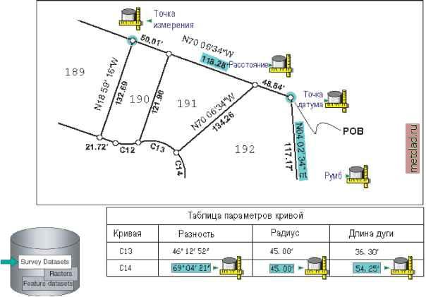Вы можете импортировать полученные в поле измерения геодезических приборов и работать с ними. Определение точек с помощью координатной геометрии Румбы и расстояния, показанные на границах участков на планах территориальных единиц, могут сохраняться в наборе геодезических данных и использоваться в вычислениях координатной геометрии COGO для определения новых координат. Измерения, выполненные геодезистами и нанесенные на абрис (схематичный чертеж съемки), например, расстояния, полученные с использованием мерной ленты, могут быть также использованы для определения местоположения точек с использованием геометрии COGO. План территориальной единицы ![]() ![]() Вы можете ввести донные для коорАинатной геометрии с планов и абрисов, чтобы определить местоположение геодезических точек, которые используются для уточнения геометрии пространственных объектов.