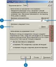 Главная --> Промиздат --> Геодезически определенные классы ся при хранении в наборе геодезических данных. Точнее, поправки - это простейшее преобразование, применяемое непосредственно как часть вычисления. При этом затрагиваются не введенные значения, а вычисляемые координаты. Автоматическое присвоение названий точкам Когда поля идентификаторов точек используются для определения новых геодезических точек, они автоматически предлагают название точки по умолчанию. Зачастую вам может понадобиться использовать согласование названий для конкретных категорий геодезических точек. Например, вы можете предпочесть, чтобы названия всех точек теодолитного хода начинались с символов Tv и образовывали последовательность Tv10, Tv20, Tv30, и т.д. Вы можете контролировать название, предложенное по умолчанию, путем ввода начальной части строки и выбора приращения, которое должно добавляться к числовой части строки. Этот формат присвоения названий и приращение применяются для каждого отображаемого по умолчанию названия новой точки. ► Определение угловой поправки для вычислений COGO 1. В меню инструменты выберите опцию Настроить. 2. Откройте закладку Команды. 3. В списке Категории выберите Редактор съемки. 4. Мышью перетащите команду Коррекция дирекционного угла на панель инструментов Редактор съемки. Закройте диалоговое окно Настроить. 5. Откройте меню Редактор на панели инструментов Редактор и нажмите Начать редактирование. 6. В открывающемся меню Проект на панели инструментов Редактор съемки выберите проект съемки, для которого вы хотите изменить угловую поправку. 7. Нажмите кнопку Коррекция дирекционного угла. Откроется диалоговое окно Инструмента коррекции дирекцион-ного угла. 8. Подтвердите, что коррекция угла будет применена к правильному проекту съемки. 9. Перетащите направление на карте. Значение направления будет добавлено в поле Направление базиса. В качестве альтернативы вы можете набрать значение Направления базиса. ► ![]() 10. Наберите значение в поле Направление базиса. Поле Кор-рекционный угол будет обновлено. 11. Нажмите Применить к проекту. Диалог Инструмент коррекции дирекционного угла закроется автоматически. 12. Выберите Редактор на панели инструментов Редактор и нажмите Сохранить изменения. Использование приращения для названий точек 1. В меню Редактор съемки выберите Редактор и нажмите Опции. 2. Откройте закладку Точки. 3. Наберите начальную часть названия точки, которая будет использоваться по умолчанию, в текстовом окне Начальная точка. 4. Наберите инкремент (величину, на которую каждый раз будет увеличиваться предыдущее значение) для числовой части названия в текстовом окне Приращение. 5. Проверьте, чтобы значение в окне Название следующей точки соответствовало выбранным вами параметрам. 6. Нажмите OK. ![]()
