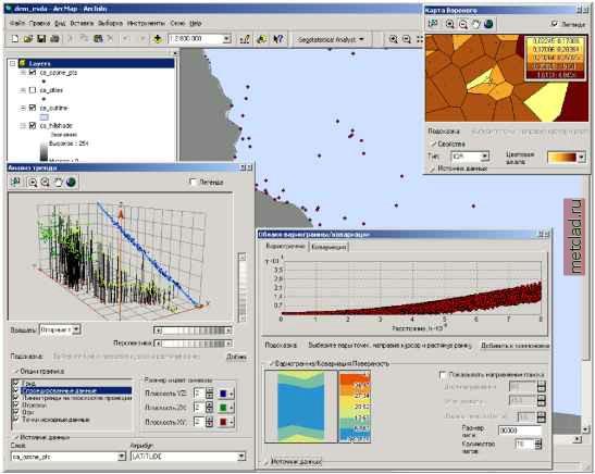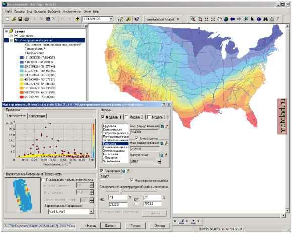 Главная --> Промиздат --> Интерполирование поверхности интерполирование поверхности Построение поверхности с использованием модуля Geostatistical Analyst включает три ключевых этапа (проиллюстрированных на следующих страницах): Исследовательский анализ пространственных данных Структурный анализ (вычисление и моделирование свойств поверхности в соседних точках) Интерполирование поверхности и оценка результатов Программное обеспечение включает серию легких в использовании инструментов и мастеров операций, которые проведут вас по каждому из этих этапов. Оно также включает целый ряд уникальных инструментов для статистического анализа пространственных данных. Исследовательский анализ пространственных данных Используя измеренные значения в онорнгх точках, с помощью модуля Geostatistical Analyst можно интерполировать значения в других точках в пределах данной территории, для которгх измерения не проводились. Инструменты исследовательского анализа пространственнгх даннгх, включенные в модуль Geostatistical Analyst, применяются для оценки статистических свойств данных, таких как изменчивость пространственнгх данных, их зависимость и глобальные тренды. ![]() Для изучения свойств значений концентраций озона, измеренных на станциях мониторинга в Карпатах, использован ряд инструментов исследовательского анализа пространственных данных. Моделирование вариограммы Геостатистический анализ данных происходит в два этапа: 1) моделирование вариограммы или ковариации для анализа свойств поверхности, и 2) кригинг. В модуле Geostatistical Analyst возможно использование целого ряда методов, основанных на кригинге, включая методы ординарного, простого, универсального, индикаторного, вероятностного и дизъюнктивного кригинга. ![]() Нарисунке проиллюстрированы две стадии геостатистического анализа данных. На первом этапе для построения модели распределения зимних температур по территории США был использован Мастер построения вариограммы/ковариаиии. Затем эта модель была использована для составления карты распределения температур.