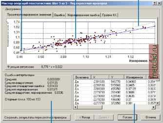 Главная --> Промиздат --> Интерполирование поверхности 20. Отключите опцию Форма - модуль Geostatistical Analyst будет использовать параметры, предложенные по умолчанию (ранее втчисленные в диалоге Вариограмма/Ковари-ация). 21. Нажмите Далее в диалоге Поиск соседства. Перед тем, как перейти к построению поверхности, вы воспользуетесь диалогом Перекрестная проверка, чтобы выполнить диагностику параметров и определить, насколько хорошей будет ваша модель. Перекрестная проверка Перекрестная проверка дает вам представление о том, насколько хорошо модель интерполирует неизвестные значения. Для всех точек в ходе выполнения перекрестной проверки выполняется следующая операция: точки последовательно исключаются из выборки, затем вычисляется значение в этой точке с использованием оставшихся даннхх, а затем измеренное и вычисленное значение сравниваются. По суммарной статистике перекрестной проверки можно определить, подходит ли модель для составления карты. Линия, наилучшим Точечный график образом перекрестной описывающая модель проверки Линия 1:1 ![]() Суммарная статистика Результат выполнения упражнения по перекрестной проверке данных Помимо визуализации отстояния точек от линии 1:1, для оценки поведения модели могут быть использованы статистические показатели. Цель перекрестной проверки - помочь вам принять обоснованное решение о том, какая из моделей наиболее точно интерполирует значения. Для модели, которая точно интерполирует значения, средняя ошибка должна быть близка к 0, среднеквадратичная ошибка и среднее из стандартных ошибок интерполяции должно иметь наименьшее из возможнхх значение (это полезно при сравнении моделей), а среднеквадратичная нормированная ошибка должна быть близка к 1. В данном случае термин ошибка интерполяции используется для обозначения разницы между интерполированным и фактическим значением. Для модели, выполняющей точную интерполяцию, средняя ошибка интерполяции должна быть близка к 0, если интерполированные значения являются несмещенными; среднеквадратичная нормированная ошибка интерполяции должна быть близка к 1, если стандартные ошибки небольшие; и среднеквадратичная ошибка вычислений должна иметь маленькие значения, если проинтерполированные значения близки к измеренным. Диалог Перекрестная проверка также позволяет вам просмотреть графики рассеяния, на которых будут показаны: Ошибка, Нормированная ошибка, а также график КК (Квантиль-квантиль) для каждой точки выборки. 22. Выберите закладку График КК, чтобы просмотреть график Квантиль-квантиль. Из данного графика (КК) видно, что некоторые значения расположены немного выше линии, а некоторые - немного ниже линии, но большинство точек расположены очень близко к прямой пунктирной линии, что указывает на то, что ошибки интерполяции близки к нормальному распределению. 23. Чтобы выделить цветом местоположение определенной точки, выберите строку в таблице, соответствующую интересующей вас точке. Выбранная точка на диаграмме будет выделена зеленым цветом. 24. Кроме того, нажмите кнопку Сохранить результаты перекрестной проверки... с тем, чтобы использовать таблицу для дальнейшего анализа. Выбранная точка ![]() 25. Нажмите Готово. Диалог Информация о результирующем слое содержит краткую информацию о модели, которая будет использована для построен