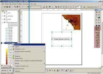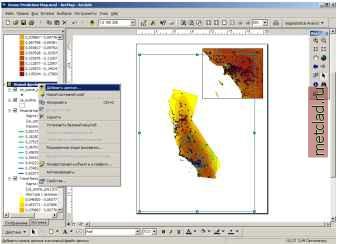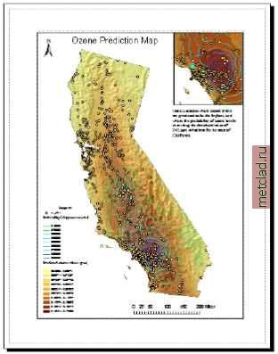Главная --> Промиздат --> Интерполирование поверхности 4. В Главном меню выберите Вставка и выберите опцию Фрейм даннхх. На карту помещена новая рамка даннхх. Теперь вы можете скопировать все слои из первой рамки в эту рамку с тем, чтобы отобразить карту значений концентраций озона для всей Калифорнии наряду с картой, показывающей в более крупном масштабе район Лос-Анджелеса. ![]() 5. Нажав правую клавишу мхши на слое Вгчтеннхй тренд , выберите опцию Копировать. 6. Нажав правую клавишу мыши на строке Новый фрейм данных в таблице содержания, выберите опцию Вставить слой. ![]() Повторите шаги 5 и 6 для всех остальных слоев. 7. Растяните Новый фрейм даннхх на всю страницу. ![]() 8. Чтобы отобразить карту целиком в Новом фрейме даннхх, на панели инструментов выберите кнопку Полный экстент. 9. Нажав правую клавишу мыши на Новом фрейме данных, выберите Свойства. 10. Выберите закладку Фрейм даннхх и аналогично тому, как вы проделали это для первой рамки, включите опцию Включить в разделе Вырезать по форме и нажмите кнопку Задать форму... Выберите в качестве лекала, по которому вы будете вырезать, слой ca outline, затем нажмите OK. Добавление отмывки и прозрачности 1. Нажав правую клавишу мыши на строке Новый фрейм данных, выберите опцию Добавить данные. ![]() 2. Перейдите к папке, в которой вы установили учебные данные (путь, предлагаемый по умолчанию -C:\ArcGIS\ArcTutor\Geostatistics), затем выберите файл ca hillshade. 3. Нажмите Добавить. На экране отобразится карта рельефа Калифорнии. 4. Перетащите слой cahillshade в нижнюю часть таблицы содержания. 5. Нажав правую клавишу мыши на слое Вычтенный тренд в таблице содержания Нового фрейма данных, выберите Свойства. ![]() 6. Выберите закладку Отображение. 7. В разделе Прозрачность наберите значение 30 (процентов). 8. Нажмите OK. Рельеф с отмхвкой будет теперь частично отображаться как подстилающий слой для слоя Вычтенный тренд . Добавление элементов карты 1. В Главном меню выберите Вставка, а затем Легенда. 2. Поместите легенду в левый нижний угол макета. 3. Дополнительно, выбрав опцию Вставка, вы можете добавить стрелку севера, масштабную линейку или текст масштаба. На следующем рисунке приведен пример окончательной карты, которую вы можете создать, воспользовавшись возможностями ArcMap. Если вам необходимо узнать больше о том, как добавлять элементы на карту, обратитесь к книге Использование ArcMap. ![]() На карте видно, что для территории к востоку от Лос-Анджелеса характерны наиболее высокие проинтерполированные значения концентрации озона и наиболее высокая вероятность того, что эти значения превысят критическое пороговое значение (0.12 ppm) в хотя бы один восьмичасовой период в течение 1996 года. Поскольку таковы результаты анализа (но помните, что исходные данные были изменены), возможно, вы захотите сфокусировать внимание на этих районах и проанализировать временные серии измерений концентраций озона с тем, чтобы точно определить районы потенциального риска.