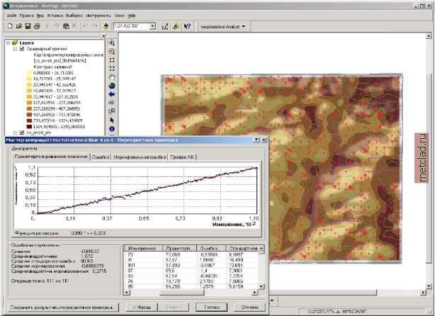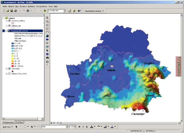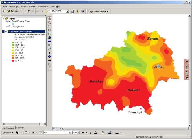 Главная --> Промиздат --> Интерполирование поверхности Интерполирование поверхности и моделирование ошибки С использованием модуля Geostatistical Analyst могут бпть созданы различные картографические слои, включая карты проинтерпо-лированных значений, карты квантилей, карты вероятностей, и карты стандартной ошибки интерполяции. ![]() В данном примере модуль Geostatistical Analyst был использован для создания карты предполагаемых значений уровня загрязнения почв радиоактивным цезием в Белоруссии после аварии на Чернобыльской атомной электростанции. Картографирование критических значений Карты вероятностей могут бпть использованы для определения участков, где значения могут превысить критические пороговые величины. ![]() Для участков, показанных темно-оранжевым и красным цветом, вероятность того, что содержание радиоактивного цезия в лесных ягодах превышает верхний допустимый уровень (пороговую величину), составляет62.5%. Проверка модели и диагностика Исходные данные могут быть разбиты на два поднабора. Первый поднабор данных может бпть использован для создания модели интерполяции. Впчисленные значения могут бпть затем сопоставлены с известными значениями в оставшихся точках с использованием инструмента проверки достоверности модели. ![]() Мастер операций проверки позволяет оценить модель, использованную для интерполяции содержания органического вещества в почве на ферме в штате Иллинойс.