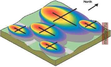 Главная --> Промиздат --> Интерполирование поверхности Анизотропия, - это, как правило, не детерминистский процесс, который может быть описан единой математической формулой. У нее нет единого источника, и она не имеет предсказуемого влияния на все измеренные значения. Анизотропия - это характеристика случайного процесса, который показывает, что пространственная автокорреляция сильнее проявляется в одном направлении, чем во всех остальных. На следующем рисунке проиллюстрировано, как процесс должен выглядеть теоретически. Снова более высокие концентрации загрязнения показаны теплыми цветами (красными и желтыми оттенками), а более низкие значения концентрации - холодными цветами (зеленым и синим). Случайный процесс показывает колебания, которые в одном направлении короче, чем в другом. Эти колебания могут быть результатом некоего неизвестного или неизмеренного физического процесса, но моделируются как случайный (стохастический) процесс с автокорреляцией в одном направлении. ![]() Поскольку в данном примере присутствует анизотропия, после построения эмпирической вариограммы можно увидеть, что пространственные отношения различны для двух направлений. В направлении север-юг форма кривой вариограммы растет перед выравниванием быстрее. Переменная A 0.04 0.035 0.03 0.025 0.02 -0.015 - 0.01 - 0.005 0