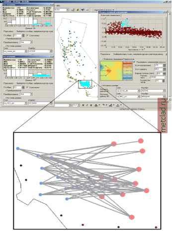 ![]() Очевидно, что значения ковариации выше, когда инструмент направления поиска ориентирован на запад. Теперь вы можете изучить, какие пары точек дают высокие значения взаимной ковариации. Для этого воспользуемся инструментами Облако взаимной ковариации и Гистограмма (рисунок на стр. 110). Если инструмент направления поиска указывает на запад, и вы выберите на графике несколько точек с высокими значениями взаимной ковариации, вы увидите, что большинство пар данных расположены в районе Лос-Анджелеса. Вы также можете заметить, что значения концентрации NO2 смещены к западу от значений концентраций озона. По гистограммам можно определить, что высокие значения ковариации для всех пар данных характерны для тех точек, где и значения концентрации NO2 (голубые столбики на гистограмме NO2), и значения концентрации озона (оранжевые столбики на гистограмме Ozone) выше своих соответствующих средних. Итак, вы определили, что асимметрия взаимной ковариации является результатом смещения высоких значений концентрации NO2 к западу от высоких значений концентрации озона в районе Лос-Анджелеса. Обратите внимание, что вы можете также получить высокие значения взаимной ковариации, когда выбранные пары из обоих наборов данных имеют значения ниже соответствующих средних для каждого из набора данных. В действительности, в целом следует ожидать, что высокие значения взаимной ковариации будут характерны для пар точек, имеющих значения как выше, так и ниже их соответствующих средних, и такие пары могут встречаться на различных участках изучаемой территории. Исследовав данные, вы определили, что значения взаимной ковариации в районе Лос-Анджелеса отличаются от значений на остальной территории штата (см. рисунок на стр. 110). Воспользовавшись этой информацией, вы можете предположить, что причиной результатов, полученных с помощью инструмента исследования взаимной ковариации, может бпть непостоянное среднее в данных, и попробовать вычесть тренды из данных со значениями концентрации NO2 и озона, либо разделить изучаемую территорию на районы и выполнить моделирование с помощью кригин-га и кокригинга в пределах этих районов. Изучение корреляции между двумя наборами данных ![]() Образование пар ме<АУ точками с высокой взаимной корреляцией ме<ду значениями концентрации озона и двуокиси азота для района Лос-Анджелеса Изучение пространственной ковариации между несколькими наборами данных Инструмент позволяет изучить взаимную ковариацию двух наборов данных. Проверьте, является ли поверхность ковариации симметричной, и воспользуйтесь инструментом направления поиска, чтобы определить, аналогично ли облако взаимной ковариации выглядит для всех направлений. Если вы обнаружите, что для значений двух наборов данных характерно пространственное смещение, или необычно высокие значения взаимной ковари-ации, вы можете исследовать, где это происходит. Если вы заметите, что необычные значения взаимной ковариации характерны для отдельных точек или ограниченных участков изучаемой территории, возможно, вы захотите что-либо предпринять, например, обратить внимание на определенные значения в данных , вычесть тренд из ваших данных или разделить данные на участки. Изучение пространственной ковариации с помощью инструмента Облако взаимной ковариации 1. В таблице со
