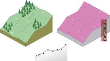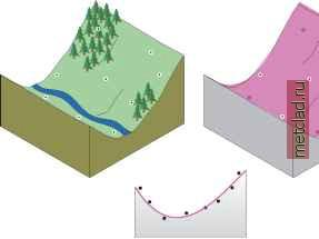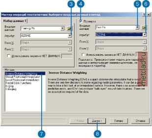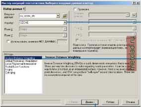Главная --> Промиздат --> Интерполирование поверхности Построение поверхности с использованием метода взвешенных расстояний (IDW) Метод IDW предполагает, что поверхность получена на основе локальной вариации. Он лучше работает, если опорные точки равномерно распределены по территории и если они не объединены в кластеры. При выполнении интерполяции по методу IDW важны следующие параметры: условия поиска соседей, степень p, и анизотропия, если она есть (см. Главу 3, Принципы геостатистического анализа). Подсказка Использование файла базы данных вместо точечного слоя Вместо слоя ArcMap может быть использован файл базы данных. Для .этого в диалоге Выберите исходные данные и метод следует нажать кнопку Пролистать и выбрать требуемый файл базы данных. См. также Для дополнительной информации о параметрах, устанавливаемых в диалоге Поиск соседства и изучения диалога Перекрестная проверка, обратитесь к Главе 7, Использование аналитических инструментов при построении поверхностей. Построение карты проинтерполированных значений 1. В таблице содержания ArcMap выберите точечный слой, который будет использован для интерполяции по методу взвешенных расстояний (IDW). 2. Запустите модуль Geostatistical Analyst. 3. В диалоге Выберите входные данные и метод в окне Атрибут определите показатель, на основе значений которого будет выполняться интерполяция по методу взвешенных расстояний. 4. Выберите Метод взвешенных расстояний. 5. Нажмите Далее. 6. В диалоге Задать параметры установите требуемые параметры и нажмите Далее. 7. Изучите результаты в диалоге Перекрестная проверка и нажмите Готово. 8. В диалоге Информация о результирующем слое нажмите OK. ![]() ![]() Создание учебных и тестовых наборов данных При выполнении проверки используются два набора данных: учебный и тестовый. Учебный набор данных содержит значения опорных точек, которые будут использованы для создания модели интерполяции. Тестовый набор данных нужен для подтверждения достоверности полученных данных. Учебный набор данных вводится как Набор данных 1, а тестовый - как Набор данных для проверки. См. раздел Выполнение проверки для геостатистического слоя, созданного из поднабора данных, в Главе 9, для дополнительной информации о создании поднаборов данных. Подсказка Использование проверки Убедитесь, что учебный набор данных содержит достаточное для точного представления поверхности количество опорных точек. Если учебный набор данных слишком мал, экстремальные (выпадающие) значения данных могут исказить параметры модели и полученные результаты. См. также Для получения дополнительной информации об определении параметров для диалога Поиск соседства и изучения диалога Перекрестная проверка обратитесь к Главе 7, Использование аналитических инструментов при построении поверхностей. Создание карты проинтерполированных значений с использованием проверки 1. В таблице содержания ArcMap выберите точечн1Й слой, который будет использован для интерполяции по методу взвешен-нгх расстояний. 2. Запустите модуль Geostatistical Analyst. 3. В диалоге Выберите входн1е данн1е и метод в окне Атрибут определите показатель, на основе значений которого будет в1полняться интерполяция по методу взвешенн1х расстояний. 4. Отметьте галочкой опцию Проверка. 5. В меню Входн1е данн1е выберите точечный слой или пролистайте папки, чтобы найти т