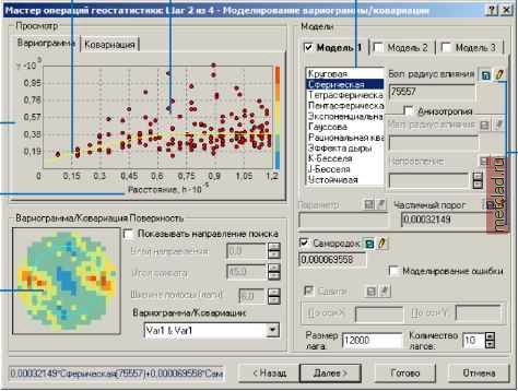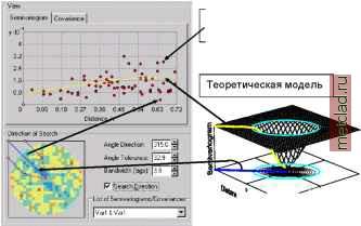 ![]() Выбор различный моделей ковариации, использование составных моделей ковариации, и выбор анизотропии, приведет к изменению теоретической модели. Вы можете сделать предварительный выбор модели, визуально определив, насколько хорошо она описывает эмпирические значения. Изменение размера лага и количества лагов и добавление смещений изменит эмпирическую поверхность ковариации, что приведет к соответствующим изменениям в теоретической модели. Модуль Geostatistical Analyst вычисляет значения по умолчанию. Однако, вы не должны ограничивать себя рамками этих параметров и воспользоваться возможностями по подбору различных значений. Для оценки достоверности результатов выполните также проверку и перекрестную проверку моделей и попробуйте найти научное обоснование для выбора наиболее подходящей модели. Диалог моделирования вариограммы/ковариации Значение вариограммы Расстояние для лага Эмпирическая поверхность вариограммы Модель, действующая по всем Облако направлениям вариограммы Возможные модели вариограммы ![]() Значения связанных параметров