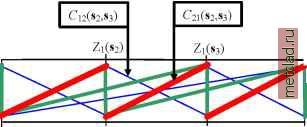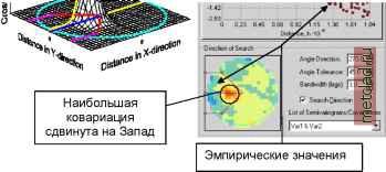 Главная --> Промиздат --> Интерполирование поверхности Использование эмпирических данных для оценки теоретических моделей Теперь для оценки теоретических моделей, которые и будут в действительности использованы для интерполяторов по методу кригинга и вычисления стандартных ошибок, вам необходимо воспользоваться вариограммами и ковариационными функциями. На следующем рисунке показаны и оцененная теоретическая модель и эмпирические значения. Эмпирические значения ![]() Модели взаимной ковариации Если у вас есть несколько наборов данных, и вы хотите использовать кокригинг, тогда вам необходимо разработать модели взаимной ковариации. Поскольку у вас есть несколько наборов данных, вы храните последовательность (ряд) переменных с индексами, где Z(s) показывает случайную переменную из набора данных k в точке s,. Тогда функция взаимной ковариации между типами даннгх k и m будет определяться как, Ckm(s sj) = COV(Zk(S.), Zm(sj)). Перед нами трудно уловимый и часто сбивающий с толку факт: Ckm(s Sj) может бпть асимметричной. В целом, Ckm(s Sj) № Cmk (s Sj) (обратите внимание на перемену мест в индексах). Чтобы понять, почему это происходит, обратимся к следующему примеру. Zl(S2) Zi(s3) Zl(S4) ![]() Z2(Sl) Z2(S2) Z2(S3) Z2(S4) Предположим, что у вас есть данные, расположенные в одном измерении, вдоль линии, и они выглядят следующим образом: В этом примере, переменные для типа 1 и 2 расположены вдоль линии равномерно, на одинаковом расстоянии; толстой красной линией показано самое высокое значение взаимной ковариации, зеленой линией - меньшие значения взаимной ковариации, а тонкой синей линией - наименьшие значения взаимной ковари-ации; если линия отсутствует, это означает нулевую взаимную ковариацию. На рисунке видно, что Z1(s,) и Z2(s,) имеют максимальное значение взаимной ковариации, когда s, = s, и это значение уменьшается по мере удаления s, и друг от друга. В этом примере, Ckm(s Sj) = Cmk(s.,s.). Однако, взаимная ковариация может бпть смещена : ![]() Zl(S4) Z2(Sl) Z2(S2) Z2(S3) Z2(S4) Теперь, к примеру, обратите внимание, что C12(s2,s3) имеет минимальное значение взаимной ковариации (тонкая синяя линия), в то время, как C21(s2,s3) имеет максимальное значение взаимной ковариации (толстая красная линия), поэтому здесь Cm(si,s.) № Cm(si,s.). Относительно Z1, взаимные ковариации Z2 были смещены на -1. Если вы выберите опцию отображения параметров смещения, модуль Geostatistical Analyst оценит любое смещение во взаимной ковариации между двумя наборами данных в двух измерениях. Эмпирические взаимные ковариации рассчитываются по формуле: среднее[ (Zj (s,.) - Zj)(ZCs ) - Z) ], где (si) - измеренное значение для набора даннгх k в точке si, Zk - среднее для набора даннгх к; среднее взято для всех si и s. , удаленных друг от друга в определенном направлении на определенное расстояние. Что касается вариограмм, модуль Geostatistical Analyst показывает и эмпирическую, и подобранную модель для взаимной ковариации.