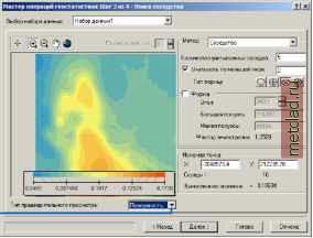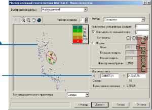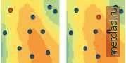 Главная --> Промиздат --> Интерполирование поверхности Проинтерполированное значение В диалоге Поиск соседства найдите рамку Искомая точка; значения полей Хи Y соответствуют координатам искомой точки на карте (которая также является центром эллипса в окне отображения данных). Определение проинтерполированного значения в определенной точке 1. Число соседей, используемых для интерполяции, и проин-терполированное значение показаны ниже полей для ввода данных (в нижней правой части диалога). Чтобы определить новую искомую точку, нажмите на нее в области отображения данных диалога. 2. Или введите значения координат X и Y Проинтерполированное значение и количество соседей будут тут же обновлены в соответствии с вновь выбранной точкой. ![]() Изменение вида карты 1. Чтобы увеличить масштаб отображения карты в диалоге Поиск соседства нажмите кнопку Увеличить, затем растяните прямоугольник на ту область, изображение которой вы хотите увеличить. 2. Чтобы уменьшить изображение, нажмите на кнопку Уменьшить. 3. Чтобы двигаться по изображению карты, нажмите кнопку Переместить, расположите курсор на изображении карты и, удерживая левую клавишу мыши, меняйте положение курсора. Карта будет смещаться в соответствии с движением курсора. 4. Чтобы отобразить карту для всей исследуемой территории, нажмите кнопку Полный экстент. 5. Чтобы осуществить предварительный просмотр результирующей поверхности, выберите в меню Тип предварительного просмотра опцию Поверхность. Чтобы вернуться к предыдущему виду, выберите опцию Соседи. ![]() ![]() Выполнение проверки и перекрестной проверки Перед построением окончательной поверхности, вы должны составить себе некое представление о том, насколько хорошо подобранная вами модель интерполирует значения в искомых точках. Перекрестная проверка и проверка помогают вам принять обоснованное решение о том, какая из моделей наилучшим образом выполняет интерполяцию значений. Вычисление статистики служит диагностикой, которая показывает, являются ли модель и связанные с ней параметры приемлимыми. Перекрестная проверка и проверка убирают из набора данных одну или несколько опорных точек, а затем для этой точки вычисляют значение. Таким способом, вы можете сравнить проинтерполированное и измеренное значение и на основе этого получить полезную информацию о модели кригинга (например, параметрах вариограммы и поиске соседей). Далее мы рассмотрим разницу между проверкой и перекрестной проверкой. Перекрестная проверка использует все данные для оценки модели автокорреляции. Затем она последовательно, по одной, убирает опорную точку и интерполирует для этого местоположения соответствующее значение. Например, на диаграмме внизу показан! 10 опорных точек, распределенных случайным образом. Перекрестная проверка пропускает точку (показанную краснхм цветом) и интерполирует значение показателя для этого местоположения с использованием остающихся девяти точек (показаннхх синим цветом). Вычисленное и действительное значение пропущенной опорной точки сравниваются. процедура повторяется для второй точки, и так далее. Для всех точек, перекрестная проверка сравнивает измеренные и проинтерполированные значения. По сути, перекрестная проверка несколько мошенничает , используя все данные для оценки модели автокорреляции. 