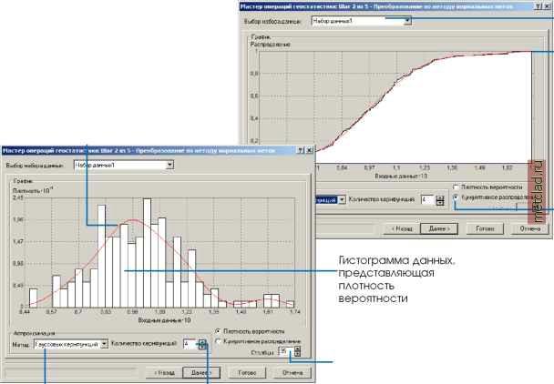 Главная --> Промиздат --> Интерполирование поверхности Диалог Преобразования по методу нормальных меток Подобранная плотность вероятности (только для метода Гауссовых кернфункций) Метод аппроксимации: Прямой (по умолчанию), Линейный, Гауссовых кернфункций ![]() Количество столбцов гистограммы Выберите количество Гауссовых кернфункций Набор данных Подобранная функция кумулятивного распределения (красная линия) Эмпирическая функция кумулятивного распределения Сравнение преобразований по методу нормальных меток с другими преобразованиями Преобразования по методу нормальных меток могут быть сопоставлены с преобразованиями по методу Box-Cox, арксинуса, и логарифмическими преобразованиями. Наиболее существенная разница между ними состоит в том, что функция преобразований NST меняет каждый определенный набор даннгх, в то время как преобразование BAL не делает этого (например, функция логарифмического преобразования - всегда натуральный логарифм). Однако цель преобразований по методу NST - сделать случайные ошибки всей совокупности (а не только опорных точек) нормально распределенными. Таким образом, важно, что кумулятивное распределение опорных точек отражает истинное кумулятивное распределение всей совокупности данных. С точки зрения классической статистики, преобразование NST, примененное к непространственным данным, может рассматриваться как метод, основанный на ранжировании. Однако, метод нормальных меток может быть полезен в геостатистике, потому что, когда данные зависимы, с использованием метода нормальных меток легче определить и смоделировать автокорреляцию. По этой причине, преобразование по методу нормальных меток должно осуществляться после вычитания тренда, поскольку ковариация и вариограммы рассчитываются для остатков (значений, оставшихся после вычитания тренда). Сопоставьте это с логарифмическим преобразованием, когда исключаются любые связи между дисперсией и трендом. Следовательно, после логарифмических преобразований вычитаются тренд и модель автокорреляции (необязательно). Часто вследствие этого появляется примерно нормальное распределение остатков, но в целом это не является специфической целью логарифмических преобразований, в отличие от преобразований по методу нормальных меток. Использование преобразований (логарифмического, по методу Box-Cox и арксинуса) Использование преобразований позволяет сделать дисперсии постоянными для всей изучаемой территории и привести данные ближе к нормальному распределению. Воспользуйтесь гистограммой и нормальными графиками КК в инструментах ESDA, чтобы, испытав различные методы преобразований, получить нормальное распределение данных. Некоторые методы геостатистики решающим образом зависят от даннгх, подчиняющихся нормальному распределению,-например, дизъюнктивный кригинг, карты квантилей и вероятности для ординарного, простого и универсального кригин-га. Поэтому выполнение преобразований может привести данные к распределению, которое ближе к нормальному, чем у исходных данных. Подсказка Когда вы можете выполнять преобразования Опция выполнения преобразований может быть использована, когда в диалоге Выберите входные данные и метод вы выбираете методы кригинга и ко-кригинга. Использование преобразований 1. В диалоге Выбор геостатистическ