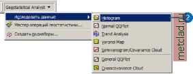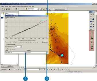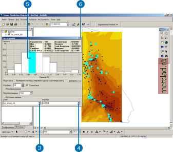 Главная --> Промиздат --> Интерполирование поверхности Упражнение 2: Исследование данных В этом упражнении вы будете исследовать ваши данные. В соответствии со структурой процесса, предложенной на предыдущей странице, для принятия оптимальных решений при построении поверхности вы сначала должны изучить свой набор данных, чтобы лучше понимать его. При изучении данных вы должны обратить особое внимание на очевидные ошибки в исходной выборке, которые могут сильно повлиять на результирующую поверхность с проинтерполированными значениями, а также исследовать распределение данных, выявить глобальные тренды и т.д. Модуль Geostatistical Analyst предлагает множество инструментов для изучения данных. В этом учебнике вы будете изучать данные тремя способами: Исследовать распределение даннхх. Выявлять тренды в ваших даннгх, если они есть. Изучать пространственную автокорреляцию и влияние по направлениям. Если вы закрапли карту после выполнения Упражнения 1, в меню Файл выберите Открпть. В диалоге в окне Искать в: перейдите к папке, в которой вы сохранили документ карты (Ozone Prediction Map.mxd). Нажмите Открпть. Изучение распределения данных Гистограмма Методы интерполяции, используемые для построения поверхности, дают лучшие результаты при нормальном распределении данных (кривая в форме колокола). Если ваши данные распределены асимметрично (неравномерно), вы можете воспользоваться возможностью преобразования данных, чтобы привести их к нормальному распределению. Таким образом, важно понимать распределение ваших данных перед тем, как вы приступи- те к построению поверхности. Инструмент Гистограмма создает гистограммы частот для атрибутов в наборе данных, позволяя вам изучать одномерное (для одной переменной) распределение данных по каждому атрибуту. Далее, вы изучите распределение озона для слоя ca ozone pts. 1. Выделите слой ca ozone pts, переместите его в верхнюю часть таблицы содержания, затем за ним поместите слой caoutline. ![]() 2. Выберите панель инструментов Geostatistical Analyst, перейдите к опции Исследовать данные и затем выберите строку Гистограмма. ![]() Вы можете изменить размер окна диалога Гистограмма таким образом, чтобы видеть одновременно и карту, как это показано на рисунке на стр. 20. 3. В окне Слой выберите ca ozone pts. 4. В окне Атрибут выберите OZONE. ![]() Распределение концентрации озона показано на гистограмме, на которой все значения объединены в 10 классов. Высота столбцов пропорциональна количеству данных с определенными значениями, попадающих в каждый класс. В целом, важными характеристиками распределения являются центральное значение, его размах и симметрия. Для быстрой проверки характера распределения: если среднее и медиана имеют приблизительно одно и то же значение, это является одним из подтверждений того, что данные подчиняются закону нормального распределения. Гистограмма, приведенная выше, показывает, что данные являются унимодальными (одновершинными) и достаточно симметричными. Похоже, что данные имеют распределение, близ- кое к нормальному. Правый хвост распределения указывает на присутствие относительно небольшого количества элементов выборки с большими значениями концентрации озона. 5. Выберите столбик гистограммы со значениями концентрации озона от 0.162 до 0.175 ppm. Элементы выборки, имеющие такие значения, будут выделены на карте. Обратите