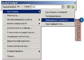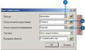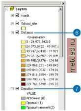 Главная --> Промиздат --> Координатное пространство Результат будет добавлен к вашему сеансу ArcMap. Ячейки с низкими значениями показывают те места, где стоимость строительства дороги будет минимальной. На рисунке внизу они показаны темно-синим цветом. ![]() 6. Щелкните в таблице содержания на выходном слое, чтобы выделить его, щелкните еще раз и переименуйте в Cost (Стоимость). Теперь удалите все слои, кроме Cost, Schoolsite и Roads. 7. Щелкните на Переклассификация landuse, затем, нажимая и удерживая Ctrl, выделите Переклассификация slope, slope и landuse. 8. Щелкните правой кнопкой на одном из слоев и выберите Удалить. Шаг 2: Вычисление расстояния с взвешенной стоимостью Вы вычислите расстояние с взвешенной стоимостью, использовав созданный набор данных стоимости (Cost) и слой Schoolsite (источник). С помощью этой функции вы создадите набор данных Расстояния, каждая ячейка которого будет содержать значение, представляющее минимальную суммарную стоимость перемещения от этой ячейки до школы и набор даннгх Направления, показывающий направление пути с наименьшей стоимостью от ячейки к школе. Суть этого процесса более подробно описана в Главе 7, Выполнение пространственного анализа . 1. Щелкните на стрелке вниз в Spatial Analyst, выберите Расстояние и щелкните на Взвешенная стоимость. ![]() 2. Щелкните на стрелке вниз в окне Расстояние до и выберите School site. 3. Щелкните на стрелке вниз в окне Растр стоимости и выберите Cost. 4. Поставьте отметку против Создать направление. 5. Нажмите OK. Наборы даннгх расстояния и направления будут добавлены к сеансу ArcMap, как слои. ![]() 6. Щелкните в таблице содержания на выходном слое расстояния, щелкните еще раз и переименуйте его в Distance. 7. Щелкните в таблице содержания на выходном слое направления, щелкните еще раз и переименуйте его в Direction. ![]() Шаг 3: Вычисление кратчайшего пути Теперь вы почти готовы к поиску кратчайшего пути от школы. Вы вычислили расстояние с взвешенной стоимостью, создав наборы данных Distance (расстояние) и Direction (направление), использовав в качестве источника место новой школы. Однако, вам еще нужно выбрать и затем создать точку назначения. Поскольку вы уже научились создавать новые шейп-файлы, шейп-файл точки назначения был для вас создан. 1. Щелкните на кнопке Добавить данные. 2. Перейдите в папку, где установлены учебные данные (путь по умолчанию - ArcGIS\ArcTutor\Spatial). 3. Выделите Destination и нажмите Добавить. Такой выбор точки назначения, какой сделан в шейп-файле Destination, позволит удалить значительную часть транспорта с существующей дороги и предоставить обратный путь к выбранному району для школьных автобусов и других машин. 4. Щелкните на стрелке вниз в Spatial Analyst, выберите Расстояние, и щелкните на Кратчайший путь. I Spatial Analyst - I Спой: Cost