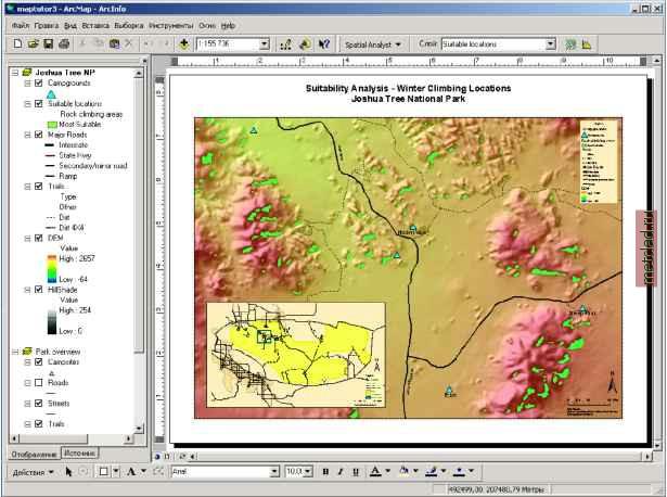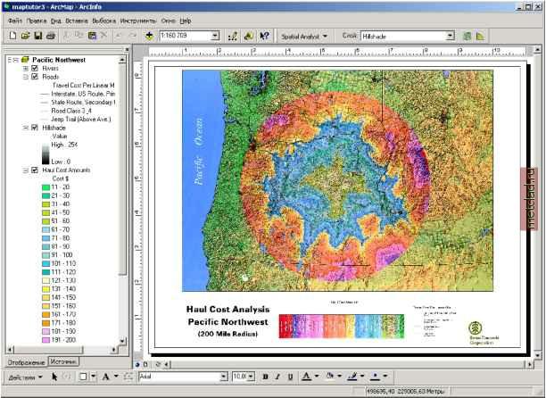 Главная --> Промиздат --> Координатное пространство Определение подходящих участков Вы можете применить Spatial Analyst для запроса по данным для определения местоположений, отвечающих набору условий, или построить карту пригодности, комбинируя различные наборы данных. ![]() Подходящие участки для зимнего восхокдения, найденные по критериям расстояния от лагеря, уклона и южной экспозиции склонов Вычисление стоимости пути Апализ стоимости пути включает моделировапие для создапия стоимостпой поверхпости, а затем вычислепие по пей оптимальпых коридоров. Расчет стоимости пути дает обширпую ипформацию для припятия решепий Haul Cost Analysis Boise Cascade Coloration, Boise, Idao BrianLiberty, NickBlacklock Copyrit @ 1997 ![]() Карта отображает путь минимальной стоимости для перевозки леса в радиусе 200миль для какдой лесопилки. Здесь учтены все препятствия для перевозки и оценена стоимость в долларах транспортировки леса от какдой точки до ближайшей лесопилки. Подсказки по изучению Spatial Analyst Если вы только начинаете знакомиться с географическими информационными системами (ГИС), помните, что вам не нужно знать все о Spatial Analyst, чтобы получить результат. Начните изучение Spatial Analyst с Главы 2, Вводный курс. Эта глава познакомит вас с некоторыми задачами, которые можно выполнить с помощью Spatial Analyst и даст вам начальные знания, чтобы перейти к решению ваших собственных задач. Spatial Analyst поставляется в комплекте с данными для работы с учебником, поэтому вы можете выполнить задания шаг за шагом на вашем компьютере. Если вы предпочитаете пропустить этот раздел и поработать самостоятельно, обратитесь к Главе 7, Выполнение пространственного анализа, содержащей руководство по основным понятиям и шагам для выполнения поставленной задачи. Поиск ответов на вопросы Как и у большинства людей, ваша цель - решить свои задачи, затратив минимум времени и усилий на изучение программного обеспечения. Вам нужны понятные, простые в использовании программные средства, позволяющие получить результат, не читая многотомной документации. Однако, когда возникает вопрос, вы хотели бы быстро получить на него ответ. Этому и посвящена данная книга - получение тех ответов, что вам нужны, тогда, когда они нужны. В этой книге описаны задачи пространственного анализа-от базов1х до сложн1х-решаемые с помощью Spatial Analyst. Вы можете прочитать эту книгу от начала до конца, но, скорее всего, вы будете пользоваться ей, как справочником. Когда вам нужно узнать, как решить конкретную задачу, например, найти кратчайший путь, просто найдите ее в оглавлении или в индексе. Вы найдете краткое пошаговое описание выполнения задачи. Некоторые главы также содержат подробную информацию, кото- рую вы можете изучить, если хотите узнать больше о понятиях, лежащих в основе выполнения задач. Эта книга призвана помогать вам при выполнении пространственного анализа, она предоставляет вам концептуальную информацию и учит процедурам решения пространственных задач. Содержание Главы 2, Вводный курс предполагает, что вы знакомы с основными понятиями ГИС и имеете представление о работе с ArcGIS. Если вы не знакомы с ГИС или ArcMap , рекомендуем вам сначала прочитать Введение в ArcGIS и Руководство пользователя ArcMap, книги, которые вы получили с пакетом ArcGIS. Это не является необходимым условием для изучения данной книги; вы можете использовать эти руководства для сп