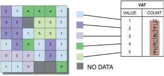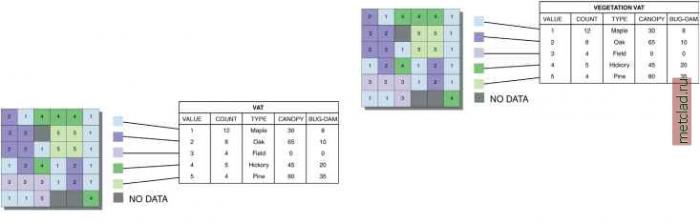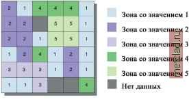 Главная --> Промиздат --> Координатное пространство Зона со значением 1 Зона со значением 2 Зона со значением 3 Зона со значением 4 Зона со значением 5 Регионы Каждая группа соединеннгх ячеек в зоне называется регионом. Зона, состоящая из одной группы соединенн1х точек, включает один регион. Зона может состоять из стольких регионов, сколько нужно для представления объекта; количество ячеек в одном регионе практически не ограничено. Spatial Analyst предоставляет инструменты для превращения регионов в отдельные зоны. В растровом наборе данных на рисунке вверху, Зона 2 состоит из двух регионов, Зона 4 - из трех регионов, а Зона 5 -только из одного региона. Значение Нет данных Если ячейке присвоено значение Нет данных (NoData), это означает, что данных о заданной характеристике в точке, которую представляет ячейка, либо нет, либо недостаточно. Значение отсутствия данных, иначе называемое пустым значением, обрабатывается всеми операторами и функциями иначе, чем другие значения. Ячейки с отсутствием данных обрабат1ваются двумя способами: 1. Присвоение значения нет даннгх результирующей ячейке, если такое значение присутствует хотя бы в одном из входных наборов данных в данной точке для оператора или локальной функции, в соседних ячейках для фокальной функции, или в зоне данной ячейки для зональной функции. ![]() 2. Игнорирование значения нет даннгх и выполнение впчис-лений со всеми существующими значениями. Второй вариант не применим при выполнении операций по двум наборам данных или для локальных функций. Если ячейка нет данных встречается в окрестности ячейки при выполнении фокальной функции или в зоне для зональной функции, по умолчанию характеристики суммы, медианы, большинства, меньшинства и разнообразия рассчитываются по всем ячейкам с известными значениями и присваиваются выходному растру (установку по умолчанию можно изменить). Связанные таблицы С целочисленными (категорийными) наборами растровгх данных обпчно связаны таблицы атрибутов. Первое поле такой таблицы - Значение (Value), в нем хранятся значения, присвоенные каждой зоне растра. Второе поле, Счет (Count), содержит количество ячеек каждой зоны в растре. Оба эти поля -обязательные. ![]() У каждого растрового набора данных должно бпть имя, чтобы отличать их от других наборов даннхх в базе даннхх. Любой доступ к растровому набору данных осуществляется через его имя, которое должно точно использоваться во всех вхражени- В таблицу можно добавить практически неограниченное количество других полей, представляющих другие атрибуты растра. ![]() Координатное пространство и растровый набор данных Координатное пространство определяет пространственные отношения между точками растрового набора данных. Все растровые наборы данных должны находиться в одном координатном пространстве. Оно может бпть системой координат реального мира или пространством изображения. Поскольку большинство растровых наборов данных представляют территорию реального мира, лучше хранить их данные в наиболее подходящей системе координат. Преобразование растровгх наборов из условной системы (пространство изображения) в систему координат реального мира называется пространственной привязкой. В растровом наборе данных ориентация ячеек определяется осями х и y системы координат. Границы ячеек параллельны осям х и y, а са