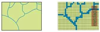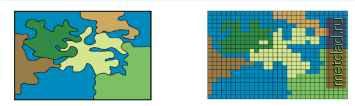 Главная --> Промиздат --> Координатное пространство Кодирование растров Процесс создания растрового набора данных подобен набрасыванию рыболовной сети на исследуемую область. Каждой ячейке присваивается код в соответствии с объектом, попавшим в эту ячейку. Код, или значение ячейки - это численное значение, соответствующее типу атрибута. Численные значения ускоряют обработку и позволяют сжимать данные. Каждая ячейка представляет часть реального мира. Ячейка может бпть любого заданного вами размера; ограничений практически нет. Главный фактор выбора размера - соответствие задачам анализа. Например, вы не станете выбирать ячейку размером один километр для изучения обитания мышей в поле. Если входные данные были полигональными, каждой ячейке выходного растра будет присвоено значение объекта, попадающего на центр ячейки. Гарантируется только то, что объект, представленный ячейкой, присутствует в ее центре. Для непре-рывнгх даннгх (см. раздел Непрерывные и дискретные данные ранее в этой главе) это единственный возможный вариант. Однако, для дискретных данных предполагается, что объект равномерно заполняет все пространство ячейки. Может получиться так, что центр ячейки не будет правильно представлять значение ячейки, но при необходимости можно уменьшить ее размер. Если входные данные были точечными, любая ячейка, на площади которой встречается точечный объект, получит значение атрибута точечного объекта из преобразуемого набора данных. По определению, точка не имеет площади, а вы преобразуете данные в площадное представление. При представлении в виде ячеек происходит некоторое обобщение исходнхх даннхх. Если в одну ячейку попадают две или более точки, Spatial Analyst случайным образом выбирает одну из них и присваивает ячейке ее значение. Таким образом, ячеек, имеющих значение, может оказаться меньше, чем точек во входном наборе. Вы должны задать достаточно мелкий размер ячейки, чтобы отразить необ- ходимое для вашего анализа количество входных данных. Преобразование линейнхх объектов в растровый набор даннхх аналогично преобразованию точечных объектов. Ячейка получает значение заданного при преобразовании атрибута любой линии, пересекающей площадь этой ячейки. Если одну ячейку пересекает несколько линий, Spatial Analyst случайным образом выбирает одну из линий и присваивает ячейке в вхходном растре ее значение. Как и с точечными данными, линейные объекты становятся шириной с размер ячейки. Например, если преобразуемые линейные данные представляют дороги, а размер ячейки - один километр, получится, что в выходном растре ширина дороги будет равна километру. Очевидно, что дорог такой ширины не бывает, значит, вы должны выбирать размер ячейки соответственно типу даннхх во входном наборе. Если размер ячейки будет один метр, дорога будет шириной в один метр. Дополнительную информацию по кодированию объектов различного типа в растрах вы найдете в следующем разделе, Представление объектов в растровом наборе данных. Представление объектов в растровом наборе данных При преобразовании точек,полилиний и полигонов в растр, вам необходимо знать, как растровый набор данных будет представлять объекты. Точечные данные Точечный объект - это любой объект, который при заданном разрешении может бпть определен, как не имеющий площади. Хотя сква