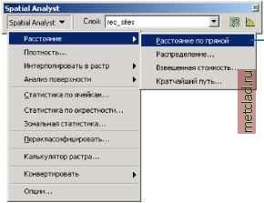 Главная --> Промиздат --> Координатное пространство Дополнительные выходные данные Растров1й набор данн1х направления расстояний по прямой Растров1й набор даннгх распределения расстояний по прямой В растре распределения расстояния по прямой каждой ячейке присваивается значение ближайшего от нее источника. Ближайший источник определяется расстоянием по прямой. Эту функцию можно использовать для присвоения объектам областей влияния, например, определение клиентов, обслуживаемых группой магазинов. В приведенном ниже примере функция распределения определяет для каждой ячейки ближайший город. Это может бпть ценной информацией, когда вам нужно найти ближайший к удаленному пункту город (подробнее об этом см. в разделе Распределение в этой главе). ![]() Распределение ячеек по источникам: к какому городу ближе какдая ячейка? Растр направления по прямой содержит направление по компасу к ближайшему источнику из каждой ячейки. Направление измеряется в градусах, 0 градусов соответствует направлению на север. В приведенном примере функция направления определила направление к ближайшему городу из каждой ячейки. Такая информация может потребоваться вертолету службы спасения для доставки пострадавшего альпиниста в больницу ближайшего города. ![]() Определение направления до ближайшего источника: Каково направление изданной ячейки к ближайшему городу? Помните, что функции расстояния по прямой сообщают вам информацию на основании Евклидова расстояния, т.е. по прямой линии. Может бпть так, что путь по прямой линии в точку назначения не осуществим, или на этом пути могут оказаться такие сложнхе препятствия, как крутой склон или река. В таких случаях для получения более реалистичных результатов вам нужно использовать функции расстояния с взвешенной стоимостью(см. Расстояние с взвешенной стоимостью далее в этой главе). Расстояние по прямой Функция Расстояние по прямой позволяет вам вычислить, насколько далеко находится каждая ячейка от ближайшего источника. Источником может быть объект, который вам требуется, от колодца или дороги до группы торговых точек, и может быть задан как в растровом, так и в векторном формате. Подсказка Установка параметров анализа Выберите Опции в панели инструментов Spatial Analyst, чтобы определить рабочую папку, экстент и размер ячейки для результатов анализа. Подсказка Поиск файлов и папок Если нужного вам файла нет в списке, или если вам нужно указать папку для записи результатов, щелкните на кнопке Обзор. Подсказка Выбор максимального расстояния Используйте инструментИзмере-ние в строке Инструменты для опредления максимального расстояния от каждого источника. Вычисление расстояния по прямой 1. Щелкните на стрелке вниз в Spatial Analyst, выберите Расстояние и щелкните на Расстояние по прямой. 2. Щелкните на стрелке вниз в окне Расстояние до и выберите слой, расстояние до которого требуется определить. 3. Вы можете указать максимальное расстояние. Ячейки вне этого расстояния не будут рассматриваться и получат значение Нет данных . Оставив максимальное расстояние пустым, вы сделаете дальность измерения неограниченной. 4. Задайте размер ячейки выходного растра. 5. Вы можете щелкнуть на Создать направление, чтобы создать растр направления по прямой к ближайшему источнику. 6. Можете щелкнуть на Создать распределение, 