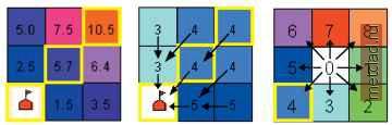 2.32 4.02 1.66 1.66 1 66 3.00 Следующая схема показывает, как образуется итоговый растр стоимости в результате сложения переклассифицированных растров уклона и землепользования, имеющих влияние 0.66 и 0.34, соответственно. Ячейки, закрашенные темно-синим, наиболее пригодны для строительства дороги, т.к. их стоимость меньше. ![]() Функция расстояния с взвешенной стоимостью Используя растры источника и стоимости, функция расстояния с взвешенной стоимостью создает выходной растр, в котором каждой ячейке присваивается значение накопленной стоимости перемещения до источника. В нашем примере функция использует растр стоимости и вычисляет для каждой ячейки вхходного растра расстояния с взвешенной стоимостью минимальную накопленную стоимость пути от данной точки до ближайшего источника. Каждой ячейке в вгходном растре расстояния с взвешенной стоимостью присваивается значение минимальной суммарной стоимости, накопленной в результате прохода по пути с наименьшей стоимостью до ближайшего источника. В примере ниже путь с минимальной накопленной стоимостью от ячейки, окрашенной в темно-красный цвет, до школы, составляет 10.5.