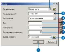 Главная --> Промиздат --> Координатное пространство Интерполяция методом сплайна Тип Сплайна Регуляризация создает плавную поверхность и уклон. Тип Сплайна Натяжение изменяет жесткость модели в зависимости от характера моделируемого явления. Параметр Число точек определяет количество точек, используемых для вычисления каждого интерполируемого значения ячейки. Чем больше точек вы зададите, тем более гладкой будет поверхность. Подсказка Выбор веса для сплайновых интерполяций Сплайн-регуляризация: Чем выше вес, тем более гладкой получается поверхность. Допускается значение веса от 0 до 5. Обычные значения: 0, .001, .01, .1 и .5. Сплайн-натяжение: Чем выше вес, тем более неровной получается поверхность и больше значений находится в диапазоне значений замеров. Значения веса должны быть больше или равны нулю. Типовые значения: 0, 1, 5 и 10. Создание поверхности с помощью Сплайна 1. Щелкните на стрелке вниз в Spatial Analyst, выберите Интерполировать в растр и щелкните на Сплайн. 2. Щелкните на стрелке вниз в окне Входные точки и выберите нужный набор точечных данных. 3. Щелкните на стрелке вниз в окне Поле Z значений и выберите поле, которое вы хотите использовать. 4. Щелкните на стрелке вниз в окне Тип сплайна и выберите нужный вам метод сплайна. 5. Можете изменить Вес, заданный по умолчанию. При методе Регуляризации, чем выше вес, тем плавнее поверхность. При методе Натяжения чем больше вес, тем грубее поверхность. 6. Можете изменить заданное Число точек для вычисления интерполяции каждой ячейки. 9. Можете изменить Размер выходной ячейки. 8. Задайте имя для результата или оставьте по умолчанию, чтобы сохранить временный набор данных в рабочей папке. 9. Нажмите OK. ![]() ![]() Кригинг Что такое Кригинг? Методе! интерполяции Обратно взвешенного расстояния (ОВР)и Сплайна (рассмотреннхе ранее) называют детерминистическими методами интерполяции, поскольку они непосредственно опираются на окружающие измеренные значения или на заданные математические формулы, определяющие гладкость итоговой поверхности. Вторая группа методов интерполяции состоит из геостатистических методов (таких, как Кригинг), основанн1х на геомоделях, включающих самокорреляцию (статистическая взаимосвязь между измеренными точками). Поэтому такая технология позволяет не только получить расчетную поверхность, но также определить значение точности или достоверности расчета. Кригинг похож на ОВР в том, что он учитахвает вес окружающих измеренных значений для того, чтобы определить расчетное значение для ячейки, в которой не было данных. Общая формула для обеих интерполяций представляет собой суммирование данных с учетом веса: Z(s,) измеренное значение в ячейке i; X. неизвестный вес измеренного значения ячейки i; s0 расположение ячейки, для которой впчисляется прогноз; N число измеренных значений. В ОВР вес, X., зависит только от расстояния от оцениваемой ячейки. Однако в Кригинге вес зависит не только от расстояния между отдельной точкой измерения и точкой вычисления, но также от общего пространственного распределения точек замеров. Для учета пространственного распределения при назначении веса необходимо вычислить автокорреляцию. Так, в обыч- ном кригинге вес, X, зависит от модели согласования точек замеров, расстояния до оцениваемой точки и пространственного распределения точек замеров вокруг