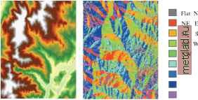 Главная --> Промиздат --> Координатное пространство Экспозиция Что такое экспозиция? Экспозиция указывает направление наиболее крутого уклона от каждой ячейки к соседним. Ее можно считать направлением уклона или направлением по компасу, куда обращен склон холма. Экспозиция измеряется в градусах против часовой стрелки от 0 (направление на север) до 360 (опять на север, сделав полн1й круг). Значение каждой ячейки в наборе даннгх экспозиции указывает направление склона в данной ячейке. Плоские участки не имеют направления, и им присваивается значение -1. W270 ![]() ![]() Flat N NE E SE S SW W NW □ Для чего нужна функция Экспозиция? С помощью функции Экспозиции вы можете: Найти на горе все склоны, направленные на север, при поиске наилучших склонов для катания на горнгх лыжах. Выяснить освещенность солнцем каждой точки территории при изучении биоразнообразия в какой-либо области. Найти все южные склоны в гористом районе, чтобы определить, где в первую очередь будет таять снег, при изучении опасности затопления жилгх районов паводком Определить плоские участки при поиске места для аварийной посадки самолета. На рисунке внизу показан входной растр высот и вхходной растр экспозиции. High ![]() Вычисление экспозиции Функция Экспозиции позволяет создать карту, отображающую направление наиболее крутого склона в каждой точке территории в направлении от ячейки карты к соседним. Чаще всего эта функция применяется к растру высот для создания карты направления склонов. Подсказка Определение направления уклона Используйте инструмент Идентифицировать из строки Инструменты для идентификации информации в ячейках. Это позволит вам узнать направление склона по компасу в любой ячейке вашего выгодного набора данных экспозиции. I Spatial Analyst Слой: [elevatio Расстояние Плотность... Интерполировать в растр Анализ поверхности Статистика по ячейкам... Статистика по окрестности... Зональная статистика... Переклассифицировать... Калькулятор растра... Изолиния... Уклон... Отмывка... Видимость... Ь1асыпи/Быемки.. Конвертировать Опции , ![]() 1. Щелкните на стрелке вниз в Spatial Analyst, выберите Анализ поверхностей и щелкните на Экспозиция. 2. Щелкните на стрелке вниз в окне Входная поверхность и выберите поверхность, для которой вы хотите вычислить экспозицию. 3. Можете изменить заданный по умолчанию Размер выходной ячейки. 4. Задайте имя для результата или оставьте по умолчанию, чтобы сохранить временный набор данных в рабочей папке. 5. Нажмите OK. Отмывка рельефа Что такое функция Отмывки рельефа? Функция Отмывки рельефа создает эффект искусственного освещения поверхности, определяя значения освещенности в каждой ячейке растра. Для этого она устанавливает позицию гипотетического источника света и втчисляет значения освещенности для каждой ячейки относительно других ячеек. Таким образом можно значительно улучшить вид данных при визуализации или создать новую информацию для дальнейшего анализа. По умолчанию оттенки шкалы серого цвета связываются с числами от 0 до 255 (по возрастанию от черного к белому). Азимут - это угловое направление расноло-жения солнца, измеряемое от севера против часовой стрелки, в градусах от 0 до 360. Азимут 90 - это восток. По умолчанию установлено значение 315 (северо-запад). Высота - это угол высоты источника освещения над горизонтом. Единицах измерения - градусы, от 0 (гори