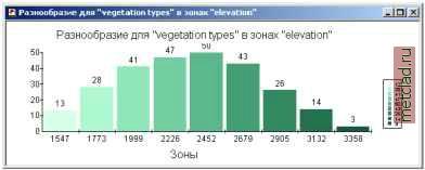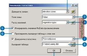 Входной набор данных зон: зоны высот (Высота от 1,547до 3,358 м) Выходная таблица ![]() Входной растр значений: виды растительности ![]() Выходная диаграмма Подсказка Использование значения Нет данных Отключите опцию Игнорировать .значения Нет данных при вычислениях, если вы хотите, чтобы значения Нет данных учитывались в вычислениях. Если в пределах зоны встретится значение Нет данных , выходное значение для этой .зоны будет Нет данных , так как недостаточно информации для завершения вычислений. Оставьте опцию Игнорировать Нет данных включенной, если вы хотите, чтобы значения Нет данных игнорировались. При вычислениях в каждой зоне будут использоваться только те ячейки растра значений, в которых содержатся реальные значения. Создание диаграммы зональной статистики 1. Щелкните на стрелке вниз в Spatial Analyst и выберите Зональную статистику. 2. Щелкните на стрелке вниз в окне Набор данных зон и выберите слой, который вы хотите использовать. 3. Щелкните на стрелке вниз в окне Поле зоны и выберите в слое зон нужное поле. 4. Щелкните на стрелке вниз в окне Растр значений и выберите нужный растр. 5. Уберите отметку против Игнорировать Нет данных при вычислениях, чтобы значения Нет данных из растра значений учитывались в вычислениях. 6. Поставьте отметку против Присоединить выходную таблицу к слою зон. Обратите внимание, что это возможно только для слоев, а не для наборов данных с диска. 7. Щелкните на стрелке вниз в окне Диаграмма статистики и выберите тип статистики для диаграммы. 8. Задайте имя для результата или оставьте по умолчанию, чтобы сохранить временный набор данных в рабочей папке. 9. Нажмите OK. Слой: I elevation zones Spatial Analyst Расстояние ► Плотность... Интерполировать в растр ► Анализ поверхности ► Статистика по ячейкам , Статистика по окрестности... Зональная статисти Переклассифицировать. Калькулятор растра , Конвертировать Опции , ![]() зональной статистики Функция Зональной статистики позволяет вам вычислять статистику для каждой зоны набора данных зон на основании информации из растра значений. Это может быть средняя плотность населения в зоне, загрязнение окружающей среды или тип растительности для зон высот.