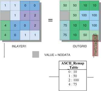 rec1ass([in1ayer1], c:\data\ASCII Remap Tab1e.txt) выбранной опции. В следующем примере выполняется идентификация и затем изменение значения ячейки. Сравнение функций Slice и Reclass в отношении таблиц перекодировки Функция Reclass удобна при изменении отдельнгх значений на новые, в то время как специализация Slice - изменение диапазонов значений. Slice также предоставляет несколько специальных возможностей, например, разделение значений ячеек на группы, основываясь на диапазоне значений или на числе ячеек в каждой группе. При выполнении некоторгх типов переклассификации можно использовать любую из функций, а в других случаях одна из функций может вхполнить задачу более эффективно. Далее приведены различия в использовании этими двумя функциями таблиц перекодировки: Slice всегда рассматривает диапазоны значений, а Reclass изменяет отдельные значения, если не заданы точные диапазоны. Reclass может копировать исходные значения в вгходные значения. Slice изменяет все значения. Reclass не может использовать таблицу перекодировки в формате INFO для переклассификации диапазонов.
