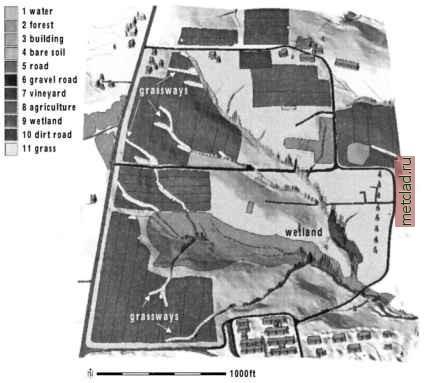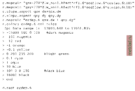 Главная --> Промиздат --> Map principle The displayed map shows that almost each field needs two or more grassways, (Figure 12.6). And the report provides us with an estimate of over 1 acre for grassed area within the fields. Net erosion and deposition modeling using flow divergence. Our previous examples involving erosion processes (both for Spearfish and for grassways) focused on soil detachment. However, the detached soil can be deposited relatively close to the source without causing pollution problems in the streams. Simulating net erosion and deposition under spatially variable topographic and land cover conditions is a complex task and requires external simulation tools. However, a simplified estimate of erosion and deposition pattern can be obtained relatively easily using the concept of flow divergence. ![]() Figure 12.6. Proposed grassways viewed as dense sites draped over DEM with the current land cover displayed as a color map. The DEM has buildings and sediment flow potential added to elevation to enhance the understanding of relation between flow and land use in the watershed The Unit Stream Power Based Erosion/Deposition model (USPED, Mitasova et al., 2001) estimates a simplified case of erosion/deposition using the idea originally proposed by Moore and Burch, 1986. It combines the RUSLE parameters and upslope contributing area per unit width A to estimate the sediment flow T: The net erosion/deposition D is then computed as a divergence of sediment flow: where ain degrees is the aspect of the terrain surface (direction of flow). The exponents m,n control the relative influence of water and slope terms and reflect the impact of different types of flow. The typical range of values is m = 1.0 - 1.6, n = 1.0 - 1.3, with the higher values reflecting the pattern for prevailing rill erosion with more turbulent flow when erosion sharply increases with the amount of water. Lower exponent values close to m = n = 1 better reflect the pattern of compounded, long term impact of both rill and sheet erosion and averaging over a long term sequence of large and small events. Caution should be used when interpreting the results from USPED, because the RUSLE parameters were developed for simple plane fields and detachment limited erosion. We have already computed slope, aspect, and flow accumulation map layers. We now need to use them to compute the estimate of sediment flow and its divergence, while taking into account variability in land cover. First, we create a C factor map layer by recoding the land cover map, where we will recode the forest to 0.0005, grass to 0.005, agricultural fields, including the grapes and gravel road to 0.5, dirt road to 0.7, and bare soil to 0.8: ![]() ![]() To account for variability in soils and to incorporate the relative impact of rainfall, we also include the K and R = 270 factors. We use the topographic sediment flow map sedflow.6 (m = n = 1) and compute the net erosion/deposition using the equation 12.4: ![]() Red-orange-yellow areas show erosion and blue shades represent deposition. Obviously, concentrated flow appears to be the largest source of sediment pollution which we have addressed in the previous paragraph. About one magnitude lower, but still very high erosion is predicted in the agricultural fields, if they were managed as a single, homogeneous area which can be bare for several weeks or even months. We can also see that not all of the eroded soil will be transported out of the fields. A substantial portion can be deposited directly in the field concave areas and an additional amount is deposited on the border of the field, where water is slowed down by grass. To improve the stability of the fields, they have been divided into subsections which are planted with