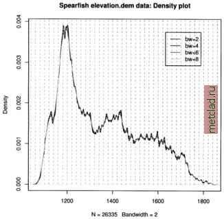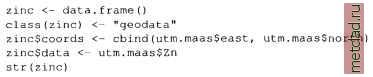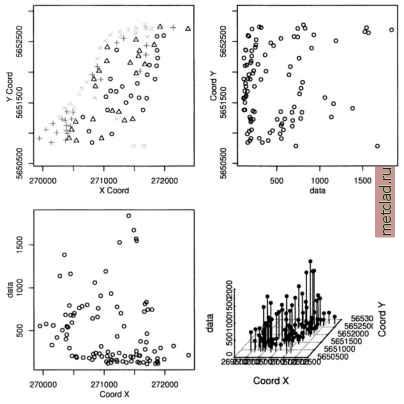 Главная --> Промиздат --> Map principle ![]() Figure 13.7. R/GRASS: Density plot of Spearfish elevation.dem data see a local over-representation of the contours compared to the interpolated values (depending on interpolation method, see Jacoby, 1997:23pp for details). Note that NA values are not permitted in the R density function, therefore we mask them on the fly. The legend has to be placed by mouse into the graph, the locator() function silently waits for a click of the middle mouse button: plot(density(na.omit(elev.f$z), bw=2), col= black , main= Spearfish elevation.dem data: Density plot ) lines(density(na.omit(elev.f$z), bw=4), col= green ) lines(density(na.omit(elev.f$z), bw=6), col= brown ) lines(density(na.omit(elev.f$z), bw=8), col= blue ) for (i in seq(1000, 1900, 20)) lines (c (i,i), c(0,0.015), lty=2, col= grey ) legenddocator 0 , legend=c ( bw=2 , bw=4 , bw=6 , bw=8 ), col=c( black , green , brown , blue ), lty=l) Instead of the locator() function you can also specify x,y coordinates related to the current coordinates ranges. In our example, you may specify 1600, 0.004 instead of locator(). The graph (see Figure 13.7) shows only slight artifacts up to a kernel bandwidth of 4 meters. These methods may ![]() You can see the complete list of variables in the utm.maas object with str(utm.maas). The second plot() command plots only a subset of all variables. As we want to analyze the zinc contamination, we focus on these be interesting to compare results from different interpolation methods as described in Section 6.4.3 or to verify unknown interpolated data. 13.2.2 Maas river bank soils data analysis When analyzing spatial data taken at various sample locations, we may be interested in predicting values in unsampled areas. With variogram modeling and kriging we can generate raster surfaces from point spatial data. GRASS does not include functional modules for analysis of variograms, but R provides extended capabilities. See Section 7.3.8 for a short discussion on geostatis-tics, kriging and splines. The next examples cover basic data analysis while variogram analysis and kriging are not presented due to the complexity of the topic. The R libraries fields and geoR, partly also the R/GRASS interface provide the relevant functionality and examples. To do the following examples we must run R from inside GRASS. This time we will use the data set which is stored in the R/GRASS interface (and which was the base for the GRASS Maas LOCATION). Maas soil data analysis. To set the environment, start GRASS with the maas LOCATION and R within GRASS. Note that you can always use help(function) to read a functions help page and example(function) to run the examples provided for that function. This will also show examples explained in this section as they are based on the interface documentation. Inside R first load the environment and, in this case only for plotting purposes, the library geoR (Ribeiro and Diggle, 1999, Ribeiro and Diggle, 2001, see also online10) which provides numerous geostatistical functions: grass53 /usr/local/share/grassdata/maas/userl/ g.region -dp library(GRASS) G <- gmeta() library(geoR) Next load the maas data set (this time directly the built-in data). The Maas data set contains numerous variables. You can plot all variables against each other (compare Burrough and McDonnell, 1998:112): ![]() Figure 13.8. R/GRASS: Maas river bank zinc contamination data. Upper left: zinc contaminations quantile plot; upper right: zinc data against y coordinates; lower left: zinc data against x coordinates; lower right: 3D scatterplot data now. We generate an empty data frame, in which we store the coordinate pairs as matrix and the related zinc (Zn) concentrations in the data variable: ![]() The function class() is used to store the class information in the object. The plot() function uses this information to invoke the standard data plot as implemented in geoR package. As we have compounded several variables into the zinc data object, we can plot numerous graphs right away, according to the definitions in underlying functions of plot.geodataO :