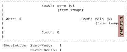 Главная --> Промиздат --> Map principle To define a new xy LOCATION, start grass53 and enter new names for LOCATION and MAPSET; for example, area-xy and userl. Similarly to the procedure described in Section 3.2 proceed to the question Please specify the coordinate system for location area-xy . The coordinate system we need here is A x,y . After entering a one line description, you reach the LOCATION region definition screen. Now define the region size in x and y direction (rows and columns). It should cover at least the size of the image or map that you want to import. The xy LOCATION can be defined larger than needed because the actual memory used depends only on the size of your imported file. When working with imagery data, set the west and south values to 0 (zero) and the north and east values to the number of rows and columns of the image (or more, compare Figure 3.7). The GRID RESOLUTION can be set to I, because the units are pixels. After leaving this menu and accepting the definition, the new LOCATION is created. You can return to the GRASS startup screen and leave it again to create the MAPSET and to enter GRASS. Later on, in Section 9.2.I, we describe a method for automatic creation of a LOCATION from a raster data set. 3.3. COORDINATE SYSTEM TRANSFORMATIONS Geospatial data for a given study area are often provided in different coordinate systems (for example, combination of the UTM, State Plane and geographic coordinates is quite common in USA). It is therefore important to have the capability to transform data between different projections and coordinate systems. ![]() Figure 3.7. Definition of a region for xy LOCATION suitable for importing an image or scanned map. Units are pixels GRASS and its projection support through PROJ4. The projection library in GRASS 5.3 is either the PROJ 4.3.3 developed by USGS (Evenden, 1995) or any later PROJ4 version used as an external library. The PROJ4 library is now maintained by volunteers6 and contains a stand-alone program cs2cs for reprojection of coordinate lists. Use GRASS with a recent version of PROJ4 recommended, as it also supports datum transformations from version 4.4.5 onwards. The general procedure for transforming between two projections is (internally) always performed through geographical coordinates: Projection1 latitude-longitude -- Projection 2 The projection information in a GRASS LOCATION is stored in the PERMANENT MAPSET in files PROJ INFO and PROJ UNITS. The following parameters may appear depending on the actual projection: proj (projection type), name (projection name), ellps (ellipsoid), a (ellipsoid: equatorial radius), es (ellipsoid: eccentricity squared), zone (zone for the area), unfact (conversion factor from meters to other units, e.g. feet), lat 0 (standard parallel), lon 0 (central meridian), k (scale factor), x 0 (false easting) and y 0 (false northing). To simplify the definition of a projection, PROJ4 provides support for EPSG (European Petroleum Survey Group) codes, aimed at standardization of common projection definitions. Projections and coordinate systems including geodetic datum can either be constructed or selected via EPSG code from predefined list entries. The list of EPSG codes is usually installed at /usr/local/share/proj/epsg. Depending on the type of data that need to be transformed, transformations can be done in two ways: ASCII file coordinate lists can be transformed between any of the more than 120 supported projections by running the external command cs2cs provided by PROJ4; raster, vector and site map layers are transformed between two existing LOCATIONS with given coordinate systems using the commands r.proj, v.proj and s.proj. 3.3.1 Coordinates lists PROJ4 provides the command cs2cs for reprojection of point lists given by coordinate pairs; for example, resulting from GPS or for map corners. On command line, the source and the target projections have to be defined. Subsequently, the coordinate pairs are queried or read from an ASCII file, transformed, and written either to the screen or redirected to an output file. The program also reports the built-in projections (p, extended list with P), ellipsoids (e), prime meridians (m), datums (d) and units (u): ![]() For example, to transform the comer points of the Spearfish LOCATION from UTM/Clark66/NAD27 to latitude-longitude/WGS84, we run (enter in one line): cs2cs -V +proj=utm +zone=13 +ellps=clrk66 +datum=NAD27 \ +units=m +to +proj=latlong This command prints out the projection parameters (due to the -v flag) and then waits for input. Now you can type in UTM coordinate pairs, optionally with the related elevation. Entering for example the north/west map corner of the Spearfish LOCATION delivers: which represents the corresponding latitude-longitude/WGS84 coordinates. The command cs2cs performs the required datum transformation. As other example, we transform coordinates from UTM/Clark66/NAD27 (Spearfish LOCATION) to LAEA/Sphere/no datum. We will store the values in a file. To get the LOCATION corner coordinates, start GRASS with the Spearfish LOCATION and run: From the reported values we create a file spearfishUTM NAD27.txt containing the following four corners. The input file must be written in plain ASCII format containing row-wise easting and northing: 589980 4928010 609000 4928010 609000 4913700 589980 4913700 Now we convert the coordinates in the file to the standard raster map projection of the National Atlas of the U.S.7, which is Lambert Azimuthal Equal Area (LAEA) on a Sphere: cat spearfishUTM NAD27.txt cs2cs -v +proj=utm +zone=13 \ +ellps=clrk66 +datum=NAD27 +units=m +to \ +proj=laea +lat 0=45 +lon 0=-100 +x 0=0 +y 0=0 +ellps=sphere\ +units=m > spearfishLAEA.txt