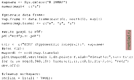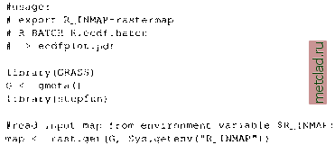 Главная --> Промиздат --> Map principle Before performing variogram modeling and kriging interpolation it is important to remove possible trends from data sets. As the zinc data probably contain a global trend, we apply a quadratic trend analysis (using Least Squares) to verify the situation: ![]() The function surf.lsO generates a trend model which is stored in object zinc.ls2. Next step is to evaluate a trend surface from this trend model by trmat.GO function. We can plot the resulting quadratic trend surface map zinc.trend2: zinc.trend2 <- trmat.G(G, zinc.ls2) plot(G, zinc.trend2) points(zinc) text{zinc$x, zinc$y, zinc$z, pos=l, cex=0.75) Alternately we can also generate a cubic trend surface in a similar way: zinc.ls3 <- surf.ls(3, zinc) zinc.trends <- trmat.G(G, zinc.ls3) plot (G, zinc.trend3) points (zinc) text(zinc$x, zinc$y, zinc$z, pos=l, cex=0.75) Finally we write the cubic trend surface map to GRASS as raster map: rast.put (G, lname= soilsph.cts , zinc.trend3) We can display this raster map with d.rast. 13.2.3 Using R in batch mode R supports batch mode processing for a fully scripted usage. Within GRASS (maybe also scripted) geospatial data analysis can be automated. The desired analysis methods have to be stored in a text file (e.g. R.trendph.batch): library(GRASS) G <- gmeta0 #load map: soilsph <- rast.get(G, soils.ph , с(F)) names(soilsph) <- c( ph ) soils.ph.frame <- data.frame(east(G), north (G), soilsph$ph) soilsph$ph[soilsph$ph == 0] <- NA Using GRASS with other Open Source tools (-f[-j names(soils.ph.frame) <- c( x , y , z ) #calculate cubic trend surface: library(spatial) ph.ctrend <- surf.lsO, na . omit (soils .ph . frame) ) ph.ctrend.surf <- trmat.G(G, ph.ctrend) #write plot to PDF: pdf ( trendSurf.pdf ) plot (G, ph.ctrend.surf, col=terrain.colors(20) ) contour.G(G, ph.ctrend.surf, add=T) title ( Cubic trend surface of pH values in Spearfish region ) dev.off 0 #cleanup worlspace: rmdist = Is (all = TRUE)) The last command is needed to avoid that the loaded data are stored in the R workspace file .RData. Alternately the flag --no-save can be used when running the script. The other commands used here will be known from previous sections. This script is run within GRASS (Spearfish LOCATION) through R batch mode: grass53 /usr/local/share/grassdata/spearfish/user1 g.region -dpa res=100 R BATCH R.trendph.batch cat R.trendph.batch.Rout The function (and eventual error) messages are echoed in the file R.trendph.batch.Rout for batch process verification. In the example above, a plot of the trend surface in PDF format is included. You should find this file in the current directory if no erroroccurs. The next example shows a batch job which calculates the empirical cumulative distribution function (ECDF) of a given map. Here we make use of environment variables so that we can write the script as a general script for any filename. Store the script as R.ecdf.batch: ![]() ![]() To run it you have to define the GRASS raster map name to be analyzed in the environment variable $R INMAP. We define it before starting the batch job (here for bash shell): grass5 3 /usr/local/share/grassdata/spearfish/user1 g.region -dpa res=30 export R lNMAP=elevation.dem R BATCH R.ecdf.batch cat R.ecdf.batch.Rout The resulting PDF file ecdfplot.pdf contains the graph showing the hypsometric integral of the input map (here: elevation.dem). When using above approach with environment variables, complex (pseudo) GRASS scripts can be written to extend functionality of GRASS by R. 13.3. GPS DATA HANDLING The FreeGIS Web portal lists a set of programs freely available to handle GPS data. A basic problem to be addressed is the data transfer from GPS device to GIS including eventual datum transformations. These issues heavily depend on the GPS device. We only refer to a few software packages: GPS Manager (GPSMan11) is a graphical manager of GPS data that makes possible the preparation, inspection and edition of GPS data in a friendly environment. GPSMan supports communication and real-time logging with both Garmin and Lowrance receivers and accepts real-time logging information in NMEA 0183 from any GPS receiver;