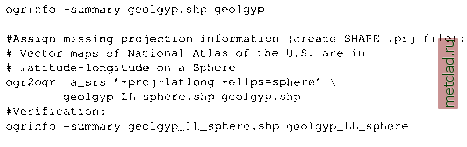 Главная --> Промиздат --> Map principle The command line will reproject the coordinate pairs stored in file spearfishUTM NAD2 7.txt to coordinates in Lambert Azimuthal Equal Area on a Sphere without geodetic datum and write the result to file spearfishLAEA.txt: ![]() 3.3.2 Map layers The projection of raster, vector and site map layers between two different coordinate systems requires two LOCATIONs: one LOCATION holding the source map layer and input coordinate system information, and another LOCATION for reading the target coordinate system information and storing the projected map layer. We will illustrate the procedure using the following example. All maps such as the elevation raster map of the Spearfish region is available in UTM/NAD27 coordinate system (in the sample spearfish LOCATION, PERMANENT MAPSET). We want to transform this map into the spearfishNAD83 LOCATION we have defined in Section 3.2.2. We now start GRASS with the spearfishNAD83 LOCATION and pull the elevation map layer from the source LOCATION spearfish into our current LOCATION as follows: ![]() After some computation time, the source map is available projected in the current LOCATION and MAPSET. Per default, the resulting map is saved with same name. Note that the resolution and region (map extent) of the projected map layer depends on the current region settings in the target LOCATION spearfishNAD83, you can verify the settings with g.region -p. Like that you can also limit transformations to subregions with desired resolution. Please refer to the manual page of r.proj for the interpolation methods used during the transformation. Similarly, you can project the vector and site map layers: ![]() For the vector data, the entire map is always projected, because creation of sub-regions is not supported. Again, keep in mind that the included datum transfor- The following example shows how to convert a free LANDSAT-TM7 scene for the Spearfish region, as available from GLCF Maryland9, from WGS84 to NAD27 to match the Spearfish LOCATION projection: gdalinfo p033r02 9 7t20000712 zl3 nnl0.tif #EPSG codes available in /usr/local/share/proj/epsg # #Reprojection from UTM/WGS84 to UTM/NAD27/Clar]te66 # (use -tr xres yres to maintain original resolution): gdalwarp -t srs +init=epsg:26713 -tr 28.5 28.5 \ p033r029 7t20000712 zl3 nnl0.tif \ p033r029 7t20000712 zl3 nnl0 NAD27.tif #Cut out region of interest: # boundary coordinates W N E S gdal translate -projwin 589980 4928010 609000 4913700 \ p033r029 7t20000712 zl3 nnl0 NAD27.tif \ p033r029 7t20000712 zl3 nnl0 NAD27 small.tif ♦Verification: gdalinfo p033r029 7t20000712 zl3 nnlO NAD27 small.tif The preprocessed LANDSAT-7 band is ready now for import into the Spearfish LOCATION with r.in.gdal. You can also download the prepared data set from the book related Web page.10 mations (here from NAD27 to NAD83) are only supported from GRASS 5.3 onwards. 3.3.3 Reprojecting with GDAL/OGR tools Map reprojection and spatial subsetting of GIS data sets is also possible outside of GRASS. Sometimes it is more convenient to reproject maps to a desired projection (or coordinate system, ellipsoid, geodetic datum) before importing it into a GRASS LOCATION. The free GDAL/OGR libraries8 provide a set of tools to perform such map preprocessing. GDAL is the raster data engine, while OGR supports vector data. GDAL and raster data. GDAL is a translator library for raster geospatial data formats. Several tools are provided, we introduce some of them here. The general command structure is: gdalinfo -formats gdalinfo [flags] rastmap gdal translate [flags] [parameters] inrastmap outrastmap gdalwarp [flags] [parameters] inrastmap outrastmap OGR and vector data. Vector maps can be reprojected and preprocessed using the OGR library, with the SHAPE format as default output. We use the program ogrinfo to report vector map metadata and ogr2ogr to perform map reprojections. The general command structure is: ![]() In our OGR example we use the geological map from the National Atlas of the U.S. The map is provided in SHAPE format. We prepare it here for import into the Spearfish LOCATION which requires reprojection and spatial subsetting: ![]() Now the SHAPE file contains the projection information. Next we reproject to UTM/NAD27/aarke66 as required for the Spearfish LOCATION and cut out the region of interest. For convenience we use the EPSG code to select the output projection parameters. Note, that it is necessary to have the NAD datum shift files installed (see the PROJ4 web page, section Frequently Asked Questions for details): #EPSG codes available in /usr/local/share/proj/epsg # #Reprojection from LatLong/Sphere to UTM/NAD27/Clarke66 # #Cut out region of interest (boundary coords. W S E N): ogr2ogr -t srs +init=epsg:26713 +nadgrids=ntvl can.dat \ -spat -103.87111 44.37293 -103.62943 44.50174 \ geolgyp UTM NAD27 small.shp \ geolgyp LL sphere.shp #Verification: ogrinfo -summary geolgyp UTM NAD27 small. shp \ geolgyp UTM NAD27 small The resulting SHAPE map can be imported into the Spearfish LOCATION.