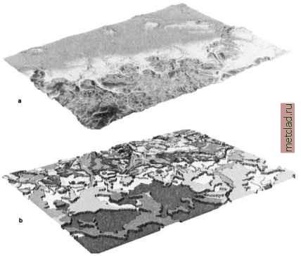 Главная --> Промиздат --> Map principle NOTES 1 GRASS 5.3 users manual, http: grass.itc.it/gdp/online.html 2 FreeGIS Web portal, http: www.freegis.org 3 OpenOSX site, http: openosx.com/products.html 4 Source for Spearfish data set: http: grass.itc.it (section sample data ) 5 Description of Spearfish data set, http: grass.itc.it/gdp/tutorial/spearDB.ps.gz 6 PROJ4 Web site, http: www.remotesensing.org/proj/ 7 National Atlas of the U.S. download area, http: nationalatlas.gov/atlasftp.html 8 GDAL library, http: www.remotesensing.org/gdal/ OGR library, http: www.remotesensing.org/gdal/ogr/ 9 GLCF Maryland LANDSAT data for Spearfish (SD) region, ftp: ftp.glcf.umiacs.umd.edu/glcf/Landsat/WRS2/ p033/r029/ 10 Spearfish LANDSAT-TM7 scene, spatial subset, reprojected to UTM/NAD27: http: mpa.itc.it/grasstutor/, data sets, file p033r029 2 0000712 NAD2 7 small.tar.gz Chapter 4 GRASS DATA MODELS AND DATA EXCHANGE GRASS stores the georeferenced data as raster, vector and site map layers. In this chapter, we explain the basic properties of GRASS data models and their management. The import and export for the various raster, vector and point data formats is presented, including a number of examples. 4.1. RASTER DATA Raster data, stored in GRASS as a matrix of values, represent either a continuous field (surface), an image, or geometric objects (points, lines, areas) corresponding to discrete fields (Figure 4.1). For surfaces, the values in the matrix are assigned to the center points of grid cells. They represent the actual measured or computed values (e.g. elevation, slope, temperature). For non-continuous fields (images, geometric objects), the values are assigned to the entire cell area and represent the category number. 4.1.1 GRASS raster data model A raster map layer is stored in GRASS as a set of files, which include the raster data and their description, organized as follows: generic matrix of values in a compressed format which depends on the raster data type (integer, floating point or 3D grid); map header which contains georeferencing data, resolution, number of rows and columns, range of values and histogram; optional category file which contains text or numeric labels; optional color table; optional timestamp; history file which contains metadata such as the data source or other information provided by the user; reclass table for a map that is a reclassification of another map. All this information is stored in the relevant subdirectories in the LOCA-TION/MAPSET directory. In the following sections, we describe how these components are managed and queried. In GRASS, raster data can be stored as a 2D integer grid, 2D floating point grid (single or double precision), or a 3D floating point grid (single or double precision). The internal GRASS raster data storage format is architecture independent and portable between 32 bit and 64 bit machines. As a result of that a GRASS DATABASE may be accessed in a heterogeneous network file sys- ![]() Figure 4.1. Types of raster data: a) continuous field, b) discrete areas