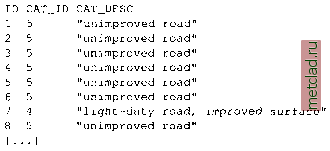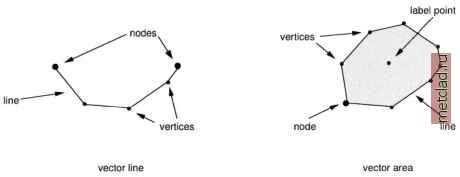 Главная --> Промиздат --> Map principle i.target. Then assign coordinates for each map portion to the four map corners with i.points and the keyboard. Using i.rectify (again with a 1st order polynomial) the map portions are transformed into the projected LOCATION. Once all scanned maps are transformed, the result can be checked in the projected LOCATION, leave the xy LOCATION for this. Now all individual maps should be checked for their correct positioning and orientation, the base accuracy. Set the current region to the maximum (i.e. the default value) with: g.region -dp Open a GRASS monitor and display each map by: d.rast ~o mapportion The overlay mode (flag -o) allows us to overlay adjacent maps. With d.zoom you can now inspect whether distortions are visible between the maps. Next, cut off unwanted map borders and patch the portions to a seamless map. We explain this later on in Section 5.4.2. 4.1.5 Export The export of raster data can be done in several ways. In GRASS 5.3 there is no general export tool available, this is planned for GRASS 5.7. Therefore a set of export modules exists which allows us to write various formats: GRASS ASCII (r.out.ascii), ARC/INFO ASCII GRID (r.out.arc), BIL (r.out.bil), BINARY ARRAY (r.out.bin), PPM (r.out.ppm), MPEG (r.out.mpeg), TIFF (r.out.tiff) and TARGA (r.out.tga). As mentioned above, only the map portion of the current region will be exported. The export modules can be used on command line as well as interactively with menus. A few modules such as the ARC/INFO ASCII GRID, GRASS ASCII and PPM export modules optionally allow us to use UNIX piping, i.e. redirecting the data stream to another module. A piping example to produce a 8 bit GIF image is: r.out.ppm elevation.dem out=- ppmquant 256 I ppmtogif>elev.gif The result of r.out.ppm is directly sent to ppmquant to quantize the 774 elevation categories to 8 bit (256 colors), then to ppmtogif. The data transfer is done through standard out (stdout) indicated by - (dash). The GIF data stream resulting from ppmtogif is written to the elev.gif file. The produced GIF file is stored into the current directory. Export to XYZ ASCII format. A common format for raster data exchange to other GIS is the plain XYZ ASCII format (i.e. x, y coordinates with the according z value). Unlike the GRASS ASCII raster export with r.out.ascii (which exports the data as an ASCII matrix), the following command produces a file with one line for each cell information, each line containing three columns (easting, northing, z): r.stats -Ig elevation.dem nv= -9999 > altitudes.txt The category label (attribute of the raster cell) is exported when using the -l flag, the optional nv parameter allows us to replace the NULL value with a different character or string. 4.2. VECTOR DATA Line, area and point features can be represented in GRASS by vector data model. It stores the features geometry, attributes and topology. Three different vector types are used to store polygons (called vector areas in GRASS), lines (vector lines), and points (vector sites). The latter are convertible from and to the native GRASS sites data model. 4.2.1 GRASS vector data model GRASS stores vector data using graphic elements (primitives) such as point, line, and area boundary (GRASS 5.7 stores additionally the centroid). Vector lines may consist of a single line (arc) or multiple connected lines (polylines). A closed ring of line segments defines a vector area. The end points of a vector ![]() Figure 4.4. Vector types in GIS: vector line and vector area ![]() This is the logical structure of GRASS vector data category numbers and labels. In the GRASS database, the internal ID (left column) is not visible to the user. GRASS vector data model includes topology, describing spatial relations between the graphic elements that define the feature location and geometry. With this type of data structure, the common boundary between two adjacent areas is stored as a single line, and shared nodes do not have to be duplicated. With topological information, it is possible to answer the following questions from a vector data set (Bartelme, 1995:18): find neighborhood relationships between objects; analyze if one object contains another object (island areas); find intersections of objects; analyze vicinity of two objects. Detailed rules for digitizing vector data in a topological GIS are given in the digitizing section. For discussions on general computational geometry, see the book of ORourke, 1998. line are called nodes, points along a line are vertices (see Figure 4.4). An area in an area is called island. Vector lines and areas have attribute data assigned as a category number (attribute ID, also called CAT ID) and an optional category label (attribute text, also called CAT DESC). Both category number and category label may be shared with other vectors. Unlike in other systems, the internal unique vector ID is not visible to the user in GRASS 5.3. To assign attribute information to vector data, a label point, which links the attribute information to the geometrical data, is required. While vector lines have the label point positioned on the line, vector areas keep their label point within the area. GRASS is capable of managing only one attribute per vector internally, but a quasi infinite number when connecting the system to an external DBMS such as PostgreSQL. The internal structure of a roads map with vector ID, CAT ID and CAT DESC may look like this: