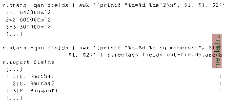Главная --> Промиздат --> Map principle ![]() r.stats -qan fields 1 640000.000000 2 600000.000000 3 300000.000000 [... ] The -a flag allows us to print the area values in square meters related to a category, while -n suppresses NULL values. The flag -q suppresses printing of percent complete messages to standard output. Note that the area calculation depends on the raster resolution. The results from r.report and r.stats should be comparable. However, we cannot use the output of r.stats as rules for reclassification of the fields map. Since we want to store the area values as category labels for each field we need to modify the output of r.stats, using a UNIX tool called awk. It is a pattern scanning and processing language which is very useful for modification of character strings and simple calculations with data stored in text files (see more details on how to use awk in the Appendix A). It allows us to modify a data stream on the fly: r.stats -qan fields 1 640000.000000 2 600000.000000 3 300000.000000 [...] ![]() r.report fields.areas [. . .] ![]() The redirection is done with UNIX piping which sends the output of r.stats directly to awk to do some formatting, then further on to r.reclass for generating the new map. If desired, you can copy the original color table from fields to fields.area with r.colors (see Section 5.1.1). Clumping raster area features. For some applications we may need to create an individual category number for each raster area (polygon). For example, when the raster map includes several areas with the same soil type (assigned the same category number), we may need to distinguish each area, in case we are interested in computing the size of each area using r.report. The module r.clump finds all areas of contiguous cell category values in the input raster map and assigns a unique category value to each such area ( clump ) in the resulting output raster map. Assume that we have a simple soils map with 3 soil types in 10 polygons. After clumping , we will have all 10 polygons numbered individually. Based on that you can assign the individual area sizes as shown above. ![]() You can move around with cursor keys and select private ownership by entering 1 on the related line. Continue with <ESC><ENTER> and leave r.mask with another <ENTER>. Now, for any map that you display, you will see only the areas belonging to private ownership. Note that at the time of writing this book, the screen shown above listed no-data as 0, which is not correct and will be changed to NULL. Note that this MASK does not apply to vector and sites maps. You can also generate MASK directly by creating a MASK file with r.mapcalc using if-condition as we explain later, or you can rename an existing binary raster map to MASK with g.rename. While some soil names are assigned to several raster polygons in the original soils map, all raster polygons in the soils.clump map are numbered individually. This is useful, e.g. to calculate area sizes of the individual patches. 5.1.7 Masking and handling of no-data values Raster MASK allows the user to block out certain areas of a map from analysis by hiding them from sight of other GRASS modules. Effectively, MASK is a raster map which contains the values 1 and NULL. Internally, the maps in use are multiplied pixel-wise with the MASK map. Those cells where the MASK map shows value 1 are available for display and computations while those masked by NULL are hidden. The map name MASK is a reserved filename for raster maps, if you have it in your MAPSET, it will be used as a mask in all raster operations. To create a MASK, you need a base map. This map is used to select which values will represent the hidden and the active areas. As an example, we may decide to work only with areas belonging to private ownership , stored in the map owner. Now start the module r.mask and select menu entry 2 Identify a new mask . It requests a map name with Enter name of data layer to be used for mask . For our example enter owner here. A new screen appears showing the categories of the owner map.