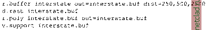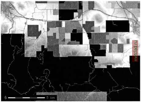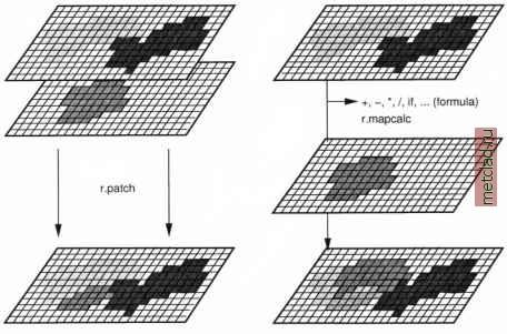 Главная --> Промиздат --> Map principle ![]() Figure 5.4. Map composite of roads, land use map and elevation model created with r.patch (Spearfish area) combining adjacent image raster maps with large number of colors is a slight problem, because the GRASS display color model significantly slows down when more than 8000 colors are used in a map. In case of 24 bit images, such as color aerial photos, the color channels R, G, B are usually kept separated. A workaround for patching high-color maps together without slowing down GRASS is the script i.image.mosaic. It merges the color tables of adjacent maps accordingly while patching the maps. For example, multiple adjacent digital elevation models can be imported and merged as follows: r.in.arc in=392619.asc out=392619.deml2 r.in.arc in=392620.asc out=392620.deml2 r.in.arc in=392626.asc out=392626.deml2 r.patch in=392619.deinl2, 392620.deml2, 392626.dernl2 out=deml2.5 To modify the color table to a suitable one for a DEM (from green over yellow to red), run: r.colors map=deml2.5 со1=дуг d.rast deml2.5 In another example, we will compose several maps within the same area. Except for the Spearfish map elevation.dem, all maps contain NULL values which are filled by the underlying map(s) (in case that they contain non-NULL values in these particular cells): r.patch in=roads,railroads,fields,elevation.dem out=map.comp d.rast map.comp Here, the roads network is on top, followed by the other maps. The DEM is filling all areas not being filled by other maps (see Figure 5.4). Map overlays can also be done with r.mapcalc. The r.mapcalc tutorial (Shapiro and Westervelt, 1992) describes several examples. Figure 5.5 shows the differences between a map merge using r.patch or r.mapcalc respectively. The module r.patch patches on a basis of overlays, while r.mapcalc combines the raster map layers base on a user defined expression, as described in the Section 5.2. For validation, the module r.cross checks the plausibility of merged maps against the input maps. Using the interactive mode of r.cross, you first have to enter the names of the source maps which have been merged earlier (at least two). When all source maps are specified, press <ENTER> one more ![]() Figure 5.5. Raster data merging with r.patch (left) and r.mapcalc (right) time to finish the dialog mode. Now you have to specify a name for the output control map containing the resulting validation. This map can be displayed and checked using d.what.rast to see whether the results are equivalent to the source data or not. In case that you want to display only the table with category labels (attributes), use r.cats in conjunction with the r.cross output map. 5.4.3 Buffering of raster features A method to widen linear or area features in space is buffering. The implementation in the GRASS r.buffer module allows us to define one or several buffers with different spatial extents. As an example, we want to find out the noise distribution along the interstate for the Spearfish area. To illustrate the use of buffers we use a simplified model which does not take wind into account. We want to know which residential areas are influenced by different levels of noise. The result may determine whether noise protection walls have to be installed or not. The buffer zones may be 250 m (high disturbance), 500 m (moderate disturbance) and more than 500 m (low disturbance). First, we have to select the interstate and store it into a new map. This can be done, for example, with r.mapcalc (if-condition) or r.reclass. Here we use the latter command to demonstrate another way of entering the class values. First, we check the category value of the interstate with r.report, and then we create the raster map interstate: ![]() We can now apply the buffer zones: ![]() We have selected the last buffer to be 2,500 meters in order to reach quasi infinity (of course, thats highly dependent of the wind direction). Finally, we have to intersect the buffered interstate map with the landuse map which contains the residential areas: r.report landuse r.mapcalc noise=if(landuse==l, interstate.buf, nullO) Using some additional commands, we can look at the noise map. The numbers as drawn by d.rast.labels represent the categories 2 (0 m to 250 m),