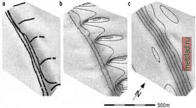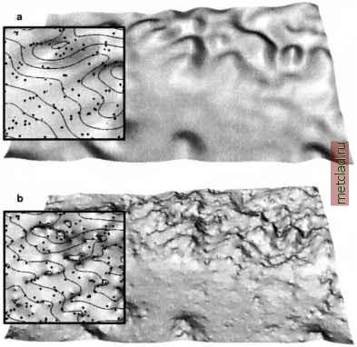 Главная --> Промиздат --> Map principle While the results may be satisfactory for many applications, it is worth exploring the full functionality of this module because it provides a number of additional capabilities, ranging from tuning the character of the resulting surface to computation of topographic parameters. Here, we discuss how to choose the parameters to optimize the spatial interpolation and evaluate its accuracy. In Chapter 12, we demonstrate the use of s.surf.rst for topographic (surface geometry) analysis. To take the full advantage of the s.surf.rst, understanding the principles behind the method is important. The mathematical description is given in the Appendix B; here we provide only a verbal description with illustrations. The RST function minimizes a specific measure of surface smoothness (also called smoothness seminorm or roughness penalty) and simulates a flexible sheet forced to pass through the data points while minimizing its energy (Mi-tas and Mitasova, 1999, Wahba, 1990, Talmi and Gilat, 1977). Properties of this function can be controlled by the tension and smoothing parameters. See the difference in the impact of these two parameters illustrated by two animations at the Multidimensional Spatial Interpolation Web site1. Tension parameter. Tension tunes the surface from a stiff plate to an elastic membrane (Figure 7.4, Mitasova and Mitas, 1993). For very high tension, the surface resembles a rubber sheet with cusps at the data points (Figure 7.4b, tension=160, default smoothing=0.1). For low tension, the surface behaves like a stiff (hard to bend) plate, creating a very smooth surface (Figure 7.4a, tension=10, default smoothing=0.1). Due to its stiffness, it can overshoot in the areas of sharp gradient change (especially if zero smoothing is used, as in Figure 7.6a); in that case, the program gives a warning and increase in tension or smoothing is suggested. The role of the tension parameter can be also interpreted as a control of the range over which the given point influences the resulting surface. For the high tension, each point influences only its close neighborhood and the surface goes rapidly to trend between the points. This may create cusps around the data points (Figure 7.4b) or steps along the contours (Figure 6.7c). With very low tension, each point has a long range of influence, so it is suitable for interpolation of areas with relatively flat terrain with data points spaced far appart. On the other hand, it may cause visible segments in large data sets (see Section 7.3.4 for a solution). The default input parameters try to adjust the tension to a suitable value based on the analysis of the data point density; however, to fully optimize the tension a more complex procedure based on cross-validation may be used (see Section 7.3.3). To explore the impact of tension (Figure 7.4), you can interpolate two different surfaces from the Spearfish random elevation data as follows: s.surf.rst elev.rnd.3k elev=elevrnd3k.tlO ten=10 s.surf.rst elev.rnd.3k elev=elevrnd3k.t160 ten=160 You can compare these results with the surface computed with the default ten-sion=40 and smoothing=0.1 in our first example in the Figure 7.3c. Because the tension parameter is scale dependent, it can have different values in different directions, supporting modeling of anisotropic surfaces and volumes (Figure 7.5, Hofierka et al., 2002a). Two additional parameters, angle and scale, were added to s.surf.rst in GRASS 5.3 for computation of surfaces with uniform anisotropy, where the new parameters theta and scalex represent the direction and ratio (scaling) of the anisotropic features. ![]() Figure 7.4. Tuning the character of interpolated surface by tension parameter: a) tension=10, smoothing=0.1 leads to a smooth surface with low level of detail useful for modeling major trends; b) tension=160, smoothing=0.1 leads to a surface with cusps (little peaks and pits) in data points, but it is smooth in between (as opposed to IDW). Note that the same smoothing was used in both examples. Compare these results with the surface interpolated with default parameters tension=40, smoothing=0.1 in Figure 7.3c ![]() Figure 7.5. RST interpolation of a beach surface surveyed by Real Time Kinematic GPS: a) given data points; b) default parameters in s.surf.rst; c) anisotropic tension with angle theta=160 degrees and scaling scalex=0.25 Smoothing parameter. The functionality of smoothing can be illustrated using springs attached to the pins representing data points. The higher the smoothing the softer the springs and the more is the surface allowed to deviate from the data point in its effort to minimize its energy. GRASS implementation supports the spatially variable smoothing parameter - each site can have different softness of its spring. The interpolation function will pass exactly through the data points that have smoothing set to zero. Uniform smoothing is given as a constant parameter smooth, while variable smoothing is given as a floating point attribute in the site file. Smoothing is important when using low tension to prevent overshoots, as well as for removing the noise which may be present in data. To explore the impact of smoothing, you can interpolate 3 surfaces from the Spearfish random site data using the default tension ten=40 and the smoothing set to a) smo=0, b) smo=10, and c) to spatially variable values with smo=0.1, if z > 1250 and smo=10 when z <= 1250 (Figure 7.6, see Figure 7.3c for the result with the default smoothing=0.1): s.surf.rst elev.rnd.3k elev=elevrnd3k.smO smo=0 s.surf.rst elev.rnd.Bk elev=elevrnd3k.sml0 smo=10 You can use awk to add the variable smoothing to your site file within the directory site lists in your MAPSET:
