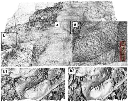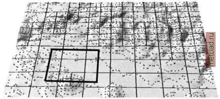Главная --> Промиздат --> Map principle ![]() Figure 7.7. Segmented processing of large data sets smooth connection of segments for very low tension. The number of points in the segment is controlled by segmax, the number of points used for interpolation (within the segment and its neighborhood) is controlled by npmin. Default values for these parameters usually work, in case that the segments are visible, npmin should be increased. Note that while s.surf.idw uses 12 given points for computation of a grid value, s.surf.rst uses at least npmin points with the default npmin=2 0 0. If the points are dense and homogeneously distributed (as is often the case with LIDAR data), both segmax and npmin can be set to lower values, leading to substantially faster computation. The IDW computes a new function for each grid point, while RST uses the same function for all grid points within one segment. Automatized collection of data points, typical for the current digitizing and mapping technologies, leads to substantial oversampling. Therefore, the most effective tool for speeding up the computation is the reduction of data points to the minimum necessary for a given accuracy and resolution. The density of points used for interpolation in s.surf.rst is controlled by the parameter dmin representing the minimum distance allowed between the data points -points that are closer to each other than this distance are considered identical and not included into interpolation. As the LIDAR data are becoming increasingly available, we use them to explain the issues related to large data sets and oversampling. Our test data set for a large coastal sand dune called Jockeys Ridge in North Carolina, USA, can be downloaded from the NOAA LIDAR Data Retrieval Tool (LDART) Web site3, where you can also learn more about the technology. Use LDART to ![]() Figure 7.8. Surface created from raw LIDAR data by s.to.rast at 1 m resolution with lots of gaps. Insert a shows the input point data with overlapping swath in detail. Insert b1 shows detail of the surface created by s.to.rast at 3 m resolution with some loss of detail. Insert b2 shows detail of a surface computed by s.surf.rst at 1 m resolution with high level of detail select the North Carolina 1999 Fall mission and an area given by the following latitude-longitude coordinates: north: south: west: east: 35.96428 35.95287 -75.63844 -75.62579 LDART allows you to select a coordinate system, for example, you can choose UTM zone 18, with the horizontal datum nad83 and vertical datum navd88. Choose bin method none to get the point data. To import the data, first create a LOCATION (zone 18, north: 3980167, south: 3978908, west: 442433, east: 443573, resolution 3 m), then use s.in.ascii with the fd=, option. LIDAR point data create almost continuous coverage of the mapped surface; therefore, you can use s.to.rast to get a quick, rough view of the surface (Figure 7.8). You can do the transformation for 1 m and 3 m resolution as follows (Figure 7.8): g.region sites=lidar99 res=l -p s.to.rast lidar99 out=lidar99.sites.Im d.rast lidar99.sites.Im g.region res=3 -p s.to.rast lidar99 out = lidar99.sites . 3m d.rast lidar99.sites.3m With the 1 m resolution, there are lots of gaps in the surface. At the lower resolution, some detail was lost, and there are still a few gaps (Figure 7.8). To interpolate a high resolution DEM, we set the resolution to 1 m and interpolate with RST (Figure 7.9): g.region res=l -p s.surf.rst lidar99 elev=lidar99.def & With the default parameters, the interpolation can run for several hours so you should run it in background (<CTRL><Z>, bg). If you drape the given site data over the interpolated surface in nviz, you can see that the measured swaths of data overlap and the surface is significantly oversampled (see insert a in Figure 7.8). You can reduce the oversampling by increasing the parameter dmin from its default value of 0.5 meters (half grid cell size) to 1 or even 2 meters without losing too much detail. The points that are closer to each other than dmin are then skipped, leading to faster computation using a smaller number of sites. The most significant speed-up can be achieved by reducing segmax and npmin values to 20 and 100 respectively, because the high density of LI-DAR data does not require big overlaps in segments to achieve the continuity in the resulting surface. If you view the result in nviz (see Figure 7.9), you can see the excellent representation of the sharp dune crests and slip faces, even without defining them as breaklines, thanks to the high density of data points. The default values for tension and smoothing preserve the noise produced by laser scanning; to reduce this noise, use higher value of smoothing. In case of millions of data points exceeding the available RAM, swapping can be avoided by splitting the data into several overlapping strips, each interpolated separately and then patched together (overlap ensures smooth connection). The segmented processing as well as the possibility of splitting the computation into overlapping strips makes the module relatively easy to adapt to parallel processing. The experimental parallel version of s.surf.rst developed by Christoph Troyer is available at the NCSU GRASS contributions Web site.4