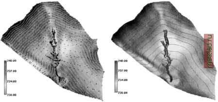 Главная --> Промиздат --> Map principle ![]() Figure 7.9. LIDAR data interpolated at 1 m resolution using the default settings of s . surf. rst. The rectangle is the area used in the previous figure illustrating the oversampling. Data are courtesy NOAA. NASA, and USGS (see the endnote of this chapter) 7.3.5 Surfaces with faults () By definition, spline is a smooth function and it has always been regarded as a tool for interpolation of smooth surfaces. However, RST can represent sharp edges or rough surfaces very well, if these features are sufficiently described by the data, as we have demonstrated in the previous section for LIDAR (see for example Figure 1.9). To create models of surfaces with complex faults pre-defined as vector lines, we can combine s.surf.rst with GRASS masking tools. We illustrate the approach using an elevation surface with a deep gully which was surveyed in the field (the data are available at the GRASS Tutorials Web site5). First, the points defining the fault need to be extracted from the measured elevation data, based on their attributes. We can format them as a GRASS ASCII vector line (see Chapter 6) using UNIX text processing tools. Then, we will import this faultline from a file gully.ascii, convert it to a raster, and use it as a mask to separate the gully area from the rest of the terrain: v.in.ascii gully.ascii out=gully v.support -r gully v.to.rast gully out=gully.mask Use the UNIX text tools to separate the points defining the gully (faultline and gully bottom) and the hillslopes, import them as point files elev.gully and elev.nogully, and interpolate with RST as follows: s.in.ascii elev.nogully input=nogully.ascii s.in.ascii elev.gully input=gully.ascii #interpolate without gully: s.surf.rst elev.nogully elev=elev.nogully #interpolate only gully: s.surf.rst elev.gully elev=elev.gully mask=gully.mask Use a mask for the gully to avoid unnecessary interpolation on the hillslopes where we do not have any gully data. The surfaces are finally merged using map algebra to create a single surface with faults (Figure 1.10): r.null gully.mask setnull=0 r.mapcalc elev.fault=if(gully.mask,elev.gully,elev.nogully) nviz elev.fault 7.3.6 Adding third variable: precipitation with elevation Multivariate interpolation is a valuable tool for incorporating the influence of an additional variable. For example, to interpolate precipitation with the influence of topography, the trivariate version of RST s.vol.rst can be used. ![]() Figure 7.10. Interpolation of a surface with fault representing an edge of a gully. Given field measured data are shown as black dots The approach is similar to the one proposed by Hutchinson and Bishop, 1983, and it is described in more detail by Mitasova et al., 1995, and Hofierka et al., 2002a. The approach requires 3D precipitation site data (x,y,z,p) and a raster DEM. The result is a precipitation raster map computed as an intersection of the precipitation volume model with the elevation surface. As an example we use the computation of long term mean annual precipitation in Slovakia using the data from over 400 meteorological stations and a 500 m resolution DEM, described in detail by Hofierka et al., 2002a (the data are available for download on the GRASS Tutorials Web site, see Endnotes). The input site data precip3d include 3D coordinates for each meteorological station and mean annual precipitation as a floating point attribute, while the dem50 0 DEM is provided as a 500m resolution raster (Figure 7.11a). The output is a 2D raster map representing precipitation called precip.topo (Figure 7.11c). The 2D region should be set to the resolution of the input DEM. The module also expects that a 3D region is defined. To create it within your current MAPSET, you have to run the g3.createwind script. To ensure that the interpolation is performed only for the area of the Slovak republic, define the mask using the provided raster file mask. The resulting 2D precipitation raster map can then be computed by s.vol.rst: g.region rast=dem500 -p gS.createwind t=3000 b=0 dres=3000 g.copy rast=mask,MASK