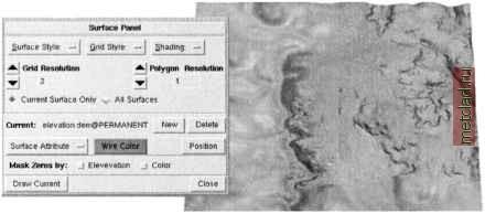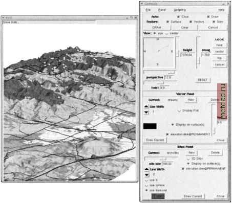 Главная --> Промиздат --> Map principle and use the interface to load your data. Alternatively, you can define the map layers that you want to visualize on the command line; for example, to view the DEM with streams, roads, and some site data from our Spearfish data set, run: nviz elevation.dem vect=streams,roads sites=archsites,bugsites The program opens a graphics window with a coarse model of the elevation surface and a control panel window. If you click on the DRAW button, the elevation model with the vector and site data draped over it will be shown at higher resolution. Depending on the size of your raster map, the surface may not be rendered at its full resolution and the view may not be optimal. In the following paragraphs, we explain how to adjust it to create a desired 3D view of studied area. Controlling the view. The position of the viewing point, viewing direction, perspective (zoom-in, zoom-out) and tilt of the surface can be adjusted using the Controls menu (Figure 8.3). Use the left mouse button to move the puck around the viewing direction square to change the position of viewer and the direction of view - the coarse model of your DEM will move simultaneously making it easier to find the desired viewing position. The perspective slider allows you to zoom-in and zoom-out while the height slider controls the viewing height. The zexag slider is used to interactively modify the z-exaggeration (it effectively multiplies the elevation data); note that it also changes the height of the view so you may need to re-adjust it. If you cannot achieve the desired view with the sliders or if you want to define an exact value for any of the viewing variables, you can type them into the related field and type <ENTER> to continue. To focus on an area off the center of your map, use the look here button to select a new center of view with a mouse click (pin your surface in your focus area). All movement of the surface will be centered around this point. To get an ortho view, click on the top button and use RESET button to get back to the default behavior. The twist slider allows you to tilt the displayed surface to simulate the view from a turning airplane. The surface with all other map layers will be rendered after each change. If you are using multiple steps to adjust the view of your surface, you can switch off this automatic rendering using the buttons in the upper part of the control menu. Modifying properties of surfaces. The viewed surfaces are managed using the options provided by the Panel Surfaces menu (Figure 8.4). In the upper part of this menu you can adjust the drawing style as well as the level of detail for the rendered surface. By default, the surface is rendered as colored polygons with Gouraud (smoothed) shading, using a coarser resolution while the surface is interactively manipulated. To change the surface display to a ![]() Figure 8.3. Spearfish geology map draped over a DEM with overlayed streams and roads as vector data, and archaeological and insect collection sites as point symbols (pyramids and spheres respectively) mesh (wire) or colored surface with a mesh, select the desired option from the menu under Surface style . For fast interactive manipulation, you can select wire from the Grid style menu. To render the surface at the current region resolution (as given by g.region), set the Polygon Resolution to 1 . Note that if the current resolution is higher than the resolution of the raster file used for topography, the raster file is automatically resampled leading to the discontinuous surface shown by Figure 5.3 (see Chapter 5). To speed up the rendering while exploring the viewing parameters you can lower the rendering resolution (increase the cell size) by choosing a higher value of polygon resolution. If you are using any style that involves wire, you can adjust its grid spacing with Grid Resolution . To drape a new color map over the surface select a new raster map using the color option from the Surface Attribute menu, for example soils.ph in ![]() Figure 8.4. Displaying topography at multiple resolutions controlled in the upper part of the Surface menu, using multiple, masked-out surfaces our Spearfish example. After loading the raster map, use DRAW to render your elevation surface with the new color map (Figure 8.3). To overlay an additional raster map, you can use transparency. However, for its meaningful application, the raster map for transparency should be fairly simple. A possible use may be to suppress (lighten) the areas outside a studied watershed. To render only a subset of the surface, you can define a raster map to be applied as a mask using the mask option from the Surface Attribute menu. Masking can also be used to create a 3D view of topography with spatially variable resolution using nested grids approach (Figure 8.4). For example, assume that you have a 100 m resolution DEM for entire region and a 20 m resolution DEM for a smaller subarea. To create a multiresolution surface, set the resolution to 20 m by g.region and start nviz -q. Switch off all automated redraw buttons in the top panel and load the two DEMs using the Panel - Surface New button. Then, with the current surface set to the 100 m resolution DEM, define its mask using the 20 m DEM through the mask option from the Surface Attribute menu. Set Polygon Resolution to 5 (5 x 20 = 100) and render the 100 m resolution DEM using the Draw current button. You will get the surface with a hole in the area where the high resolution DEM is located. Then, select the 20 m DEM as current, set Polygon Resolution to 1 and render the 20 m resolution DEM with the Draw current button and save the image if it looks good. Depending on resolution, there may be a masked strip between the two surfaces, you can use a slightly smaller raster than the inserted DEM as a mask to ensure sufficient overlap.