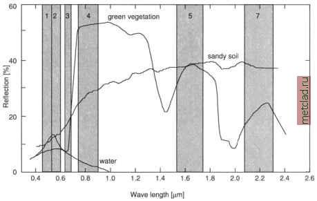 Главная --> Промиздат --> Map principle 204 60 ![]() Figure 9.2. Idealized reflection curves of green vegetation, sandy soil and water. For illustration the LANDSAT-TM5 channel filter functions except the thermal channel 6 are shown in background (curves as defined in 6S source code, Vermote et al., 1997) Details on technical aspects of satellite sensors and their characteristics can be found in Kramer, 1996, Schowengerdt, 1997, and various other remote sensing textbooks. Besides the different sensor types, satellite systems are also distinguished by their orbit: there are polar orbiting and geostationary satellite systems. The geostationary orbit is far from the earth (usually at 36,000 km above the earths surface) which allows the satellite a static position of the sensor in relation to the observed area. This orbit is used for weather and telecommunication satellites as they need to always watch the same area. Unlike that, near-polar orbiting satellites are rotating around the globe near the poles, covering the entire surface within a fixed range of days due to their own and the earths rotation. The orbits are near-polar oriented to enable the satellites to cross the earths surface everywhere at the same time. This leads to a constant solar illumination which is important for multitemporal analysis. Within this chapter we focus on methods for polar orbiting systems. Resolution. An important aspect of satellite data is the image resolution. In particular, we have to distinguish between: spatial (geometric) resolution; spectral resolution; radiometric resolution. Spatial or geometric resolution is the spatial extent of each pixel as known from the raster data. For environmental satellite data, this resolution typically ranges from 1 m to 30 m. The sensor-specific geometrical resolution limits the usability of satellite images to certain map scales: Satellites such as the U.S. LANDSAT-TM7, the French SPOT HRV, and the Indian IRS-1D, with a pixel size in their multispectral channels ranging from around 20 m to 30 m, may be used for mapping at a scale of 1:75,000 to 1:250,000. Recently, high spatial resolution satellites with 1 m pixel resolution became operational, however, they provide only a few image channels which limits the number of classes for land use classifications. Spatial resolution is closely related to geocoding. The satellite image is often distorted and registered in a non-georeferenced coordinate system. Based on ground control points (GCPs), the satellite image can be registered to a reference map. This process is called geocoding and is covered later in this chapter. If the satellite image is already geocoded, it can be imported directly into a georeferenced LOCATION. The spectral resolution refers to the bandwidth of each channel. The bandwidth is the range of the spectrum measured by one channel. Figure 9.2 shows the bandwidths of LANDSAT-TM5 channels with respect to the spectrum and object spectra. Both the higher number of channels and the bandwidth of each channel improve the potential to distinguish objects in an image. For example, when studying crop conditions, phenology-driven signal variations are found in a narrow spectral range between the red and the near-infrared spectrum. Only when this range is covered by two or more narrow bandwidth channels can the effects be studied. Later on we will show how to merge channels with high spatial resolution and with those with high radiometrical resolution to improve classifications. The radiometric resolution describes the signal dynamics within one image. While the LANDSAT-TM5 channels are effectively measured at 7 bit, other satellites have a radiometric resolution up to 12 bit (e.g. ASTER/TERRAs TIR channels) or even more. For technical details on the various satellite sensors, see the remote sensing textbooks, Kramer, 1996, or Web sites of the space agencies. In general, a pixel in remote sensing has three parameters: space, wavelength and time (Schowengerdt, 1997:16). Based on these parameters, it is possible to derive thematic maps from satellite data using various methods for image classification. 9.2. SATELLITE DATA IMPORT AND EXPORT Satellite data are provided in a variety of data formats and sometimes the user can choose according to her/his needs. Common formats are CEOS (unfortunately existing in various subformats), BIL, BSQ, GeoTIFF and others. In general two main format types have to be distinguished: formats which contain one channel per file (SUN-raster format, TIFF and PNG format); formats which contain one or more channels per file (BIL or BSQ format, CEOS (with various subformats), ERDAS/LAN, NCSA/HDF or HDF-EOS format). Before working with satellite data in GRASS, you have to verify whether your satellite data are already geocoded because the import method depends on it. This information should be delivered with the metadata belonging to the data set. If there are no metadata present, there might be the chance to retrieve metadata from the image itself using the command gdalinfo (which is part of the GDAL library). When specifying the name of the image file as a parameter, gdalinfo prints metadata such as projection and boundary coordinates if the image format supports metadata storage. After a general description of how to build the xy LOCATION, we will start to use the imagery sample data set provided for the Spearfish region. It is available at the GRASS Web site.2 Beside a SPOT-1 HRV/PAN scene, aerial photos such as NHAP (National High Altitude Photography) multispectral aerial photos and a black-and-white stereo pair with camera information are also included. 9.2.1 Import of raw and geocoded satellite data Before importing the satellite data, a LOCATION has to be defined. This can be done manually through the GRASS interface or generated automatically with r.in.gdal. Manual definition of a raw data xy LOCATION. Non-georeferenced, (raw) satellite data have to be imported into an