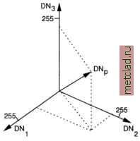 Главная --> Промиздат --> Map principle ![]() Figure 9.4. Pixel in a three-dimensional feature space with digital number (adapted from Schowengerdt, 1997:119) areas are bluish. A geocoded SPOT-1 false color image is already included in the Spearfish LOCATION (spot.image). We provide a more detailed explanation of color models and image composites in Section 9.7. 9.3.2 The feature space and image groups The processing of data from a multispectral satellite sensor is based on the concept of feature space defined by the sensor channels. Together with the definition of an image group as a combination of multiple channels, this concept is a foundation for image classifications. The feature space. The channels of a multispectral satellite sensor are considered to span a multi-dimensional coordinate system called feature space. For example, the three channels covering visible light (blue, green, red) span a three-dimensional coordinate system. Within the coordinate system (or feature space), every pixel reaches a certain position depending on the brightness levels in each channel. This position can be considered a vector in the multidimensional coordinate system. The brightness levels of the pixels in the different channels are called digital numbers (DN). Figure 9.4 shows the position of a pixel in a three-dimensional feature space, which may represent the blue (DNi), green (DN2), and red (DN3) specttum range. The concept of feature space plays an important role in image classifications that are used to derive land use maps from satellite data. Classification methods are based on the idea that pixels containing the same land use are close to each other within the multi-dimensional feature space. The number of dimensions depends on the number of input channels. For example, a number of multispectral pixels which cover a forest will show similar spectral signatures ![]() Figure 9.5. Left: Spectrum showing typical spectral response of common objects with LANDSAT-TM5 channels 3 (red) and 4 (NIR); right: Two-dimensional feature space of channels tm3 and tm4 with pixel brightness levels. Three pixels for each observed object (water, sandy soil and green vegetation) are shown with their brightness levels in 3 and 4. The feature space scatterplot (right) represents reflection per channel as appear in channels tm3 and tm4 (adapted from Neteler, 2000:158) and therefore should be assigned to land use class forest . In the process of reclassification, many methods (e.g. cluster algorithm) group adjacent pixels in the multi-dimensional feature space and assign them to the same class. Figure 9.5 shows the relationship between the spectrum and a two-dimensional feature space spanned by the red and the near-infrared channel of LANDSAT-TM5. More details on image reclassification will be explained below. For illustration, we display the feature space of two channels of the SPOT-1 satellite scene in the GRASS monitor (red and near-infrared channels): g.region rast=spot.ms.2 dcorrelate . sh spot.ins.2 spot.ms.3 The pixel clouds from the red and near-infrared channels span the two-dimensional feature space, which will be partitioned in a reclassification to extract land use classes. However, in the above scatterplot, it is difficult to visually distinguish clustered areas. If you zoom into a small subregion of a SPOT-1 HRV channel and re-run the dcorrelate.sh script, the scatter-plot will be different, with easier to distinguish pixel clusters. For higher level graphical data analysis external software like R (compare Section 13.2) or XGobi 5 are recommended. Image groups in GRASS. Since we are dealing with multi-spectral data sets, we need a method to bundle the channels which belong together. This helps when operating on multiple channels with identical geolocation. GRASS 9.4. GEOMETRIC AND RADIOMETRIC PREPROCESSING In this section, we explain how to preprocess satellite data for further analysis. After geocoding the data set, we continue with radiometric preprocessing to statistically explore the data and to extract further information. To illustrate the applications, we again use the SPOT scene as well as the free LANDSAT-TM7 scene. 9.4.1 Geometric preprocessing If the imagery data are analyzed in conjunction with other GIS data, geometric preprocessing is crucial. While it may be acceptable to use the image coordinate system for image-only analysis, for a combined image/map analysis and distribution of the results to other GIS users, a high quality geocoding is essential. Geocoding is related to the terms ground control points (GCPs, also called tie points ) and projection . Ground control points are sites of known position within an image. They are used to perform an image rectification to a reference. These GCPs can either be the four corner points of an image or, preferably, distributed over the image. If available, GPS (Global Positioning System) data can be used as reference points. General methods of geocoding. Depending on the data provider and the product level, the data set may already contain GCPs or it may be already geocoded. In the latter case, no further geocoding is needed, only potential transformation to the target coordinate system. The following situations can occur when obtaining a satellite data set: 1 the image data set has been already geocoded and projected by the data supplier; 2 the image data set is not geocoded, but contains the four corner GCPs; 3 the image data set is not geocoded, and does not contain any GCPs. Case 1: the image data set is already geocoded. In this case, you have to verify whether the data are in the target coordinate system. If so, the data offers a tool to group images by selecting the channels: i.group. Several multi-spectral image processing modules expect an image group, a few of them even need a subgroup (which may contain the same channels or a subset). Even when working only with a single image, this channel has to be assigned to a group