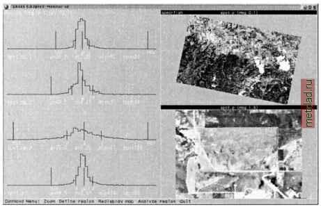 Главная --> Промиздат --> Map principle ![]() Figure 9.17. Sample screen of interactive training area identification with i.class (SPOT-1 PAN image, Spearfish region) After starting i.class., select an image group and subgroup. Then provide a name for the Result signature file . It will contain the spectral signatures for the later reclassification process. Next is the Seed signature file which allows us to read in signatures from a previous run (e.g. in case you interrupted this procedure). Skip it for the first run. Then specify a Cell map to be displayed which may be a previously generated natural or false color composite. This map, if not included in the image group, will not be considered for the image statistics. The monitor display becomes divided into three parts. In the upper right corner, you see the image. In the lower right corner, zoomed map portions will be displayed when using the ZOOM function. In the left section of the monitor, histograms for the selected training areas for all channels will be displayed. The training areas can be digitized by using the DEFINE REGION and the DRAW REGION buttons. When digitizing using the mouse, a vector line is drawn around the first training area. Keep in mind that the training area should cover a unique land use. To close the drawn polygon use COMPLETE REGION and leave the DRAW REGION menu with DONE . An example screen is shown in Figure 9.17. To verify the cluster statistics, click on ANALYZE REGION . Now the i.class module will search for spectral signatures based on the current training area within the image. The resulting histograms are shown in the left column of the monitor. The next step is to determine the class assignment to the image - the spatial distribution of the current spectral signatures can be overlayed as filled polygons with DISPLAY MATCHES (you can select a color for the area). If desired, the standard deviation can be set to a different value ( SET STD DEVs ). This way, you can try to improve the cluster statistics and display the matches again. After displaying the matching areas, you are asked whether to accept this signature. If yes, you can specify a Signature description in the terminal window for this spectral signature. You can then continue to digitize the next training area. With some experience, you will become familiar with the concept of this module. Please note that the vector lines of the digitized training areas are not stored. See the next paragraph for an alternate approach based on retrieving training areas from auxiliary maps. To obtain good results, you should not digitize border pixels of any land use patch because such pixels often contain mixed spectral signatures. It is also important not to digitize very small areas since these will be ignored for statistical reasons (i.class will print a warning message accordingly). Once you leave this module, the generated spectral signatures will be stored. The spatial assignment of the data set pixels to the classes is done with i.maxlik. Specify the file generated by i.class as the Result signature map . The other settings are the same as described in the previous section. Finally, the reclassification map and the Reject threshold map are created. Generating training areas from auxiliary maps. When additional maps with information about the current land use are available, they can be used to extract training areas. It is also useful to digitize training areas independently from i.class and store them in a separate map for later use/verification. For raster maps, r.mapcalc (if-conditions) will be useful, for vector maps it will be the v.extract module. If training areas need to be digitized from a map, v.digit can be used (see Section 6.1.2). After digitizing, vector areas have to be converted with v.to.rast to a raster map. It is very important that the training areas are assigned a vector label, for example, within v.digit. Otherwise unlabeled areas will not be converted by v.to.rast. It is also possible to digitize from a raster image with r.digit. The training map in the raster model is input for i.gensig. This module creates a signature file using the training area statistics similar to i.class. The spatial assignment of the pixels is subsequently handled by i.maxlik. Partial supervised reclassification. The partial supervised reclassification is similar to the above-described unsupervised reclassification. The difference lies in the incorporation of training areas, which have to be defined prior to the application of i.cluster using i.class or i.gensig. After preparing spectral signatures from training areas, the clustering mod- ule i.cluster is started and the Result signature file is generated with i.class or i.gensig is used as Seed signature for i.cluster. Finally the i .maxlik is used to generate the reclassification map and Reject threshold map . Beyond this step the procedure is the same as for the unsupervised classification. Also, in the reverse order, the hierarchical classification is a way to derive thematic maps from satellite data. Based on an unsupervised reclassification, potential training areas are identified and stored in a map. This map is a basis for a supervised reclassification as shown above. As signature files can be used across the modules, better results are eventually achieved through an iterative approach rather than a straight-forward classification. 9.8.3 Supervised combined geometric and radiometric reclassification GRASS provides an additional sophisticated supervised reclassification tool. The algorithm is a combined radiometric/geometric reclassification method which is called SMAP - sequential maximum a posteriori - estimation . Unlike the pixel-based approach described above, this method uses an image pyramid approach which also takes neighborhood similarities into account (Schowengerdt, 1997:107, see also Ripley, 1996:167-168). This combination leads to a significant improvement of the recla