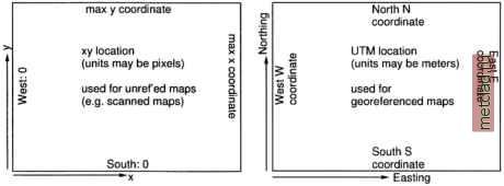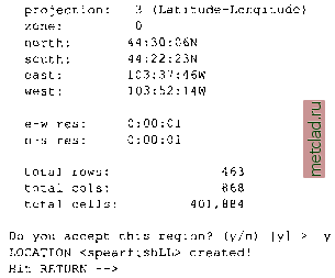 Главная --> Промиздат --> Map principle ![]() Figure 3.6. Definition of a xy LOCATION and of a projected LOCATION ![]() From the previous sections, you should understand what latitude-longitude or UTM means and you should know, based on the data that you want to work with (or from your supervisor, customer or instructor), what coordinate system you are going to use (see Figure 3.6 for a general idea). You can type again y and you will be asked to specify the new coordinate system: ![]() Type the appropriate letter, in our example it will be в for Latitude-Longitude. We accept and continue with: Please enter a one line description for location <spearfishLL> > Spearfish Latitude-Longitude WGSS? ok? (y/n) [y] у Do you wish to specify a geodetic datum for this location? у Please specify datum name Enter list for the list of available datums or custom if you wish to enter custom parameters Hit RETURN to cancel request >list Short Name Long Name / Description agd66 Australian Geodetic Datum 1966 (australian ellipsoid) wgs84 World Geodetic System 1984 (wgs84 ellipsoid) Please specify datum name Enter list for the list of available datums or custom if you wish to enter custom parameters Hit RETURN to cancel request >wgs84 Now select Datum Transformation Parameters Enter list to see the list of available Parameter sets Enter the corresponding number, or <RETURN> to cancel request Mist Number Details 1 Used in Default wgs83 region (PR0J.4 Params towgs84 = 0.ООО,0.ООО,0 . ООО) Default 3-Parameter Transformation Now select Datum Transformation Parameters Enter list to see the list of available Parameter sets Enter the corresponding number, or <RETURN> to cancel request >1 These are all required parameters for Latitude-Longitude. Next you will be prompted to define your default region by defining the boundary coordinates of the project area and the default raster resolution (here we use sexagesimal degree notation): ![]() The default raster resolution (GRID RESOLUTION) is arbitrary, because you can change it later based on the needs of your application. For Latitude-Longitude LOCATIONs, you have to define the resolution in degree/minutes/seconds as well. You can leave this screen with <ESC><ENTER> and then check the list of parameters that appears: ![]() If everything is correct, type y and RETURN and you will get back to the startup screen. Type <ESC><ENTER> again and you will get the message that your MAPSET does not exist yet (note that the MAPSET PERMANENT was created automatically): ![]() Type y and your new LOCATION with your MAPSET are created and GRASS prompt appears. You are now working in GRASS. You can check the definition of your LOCATION by running: ![]() The last command prints the geodesic resolution of the region in meters. Now the LOCATION is ready, and you can start importing data.